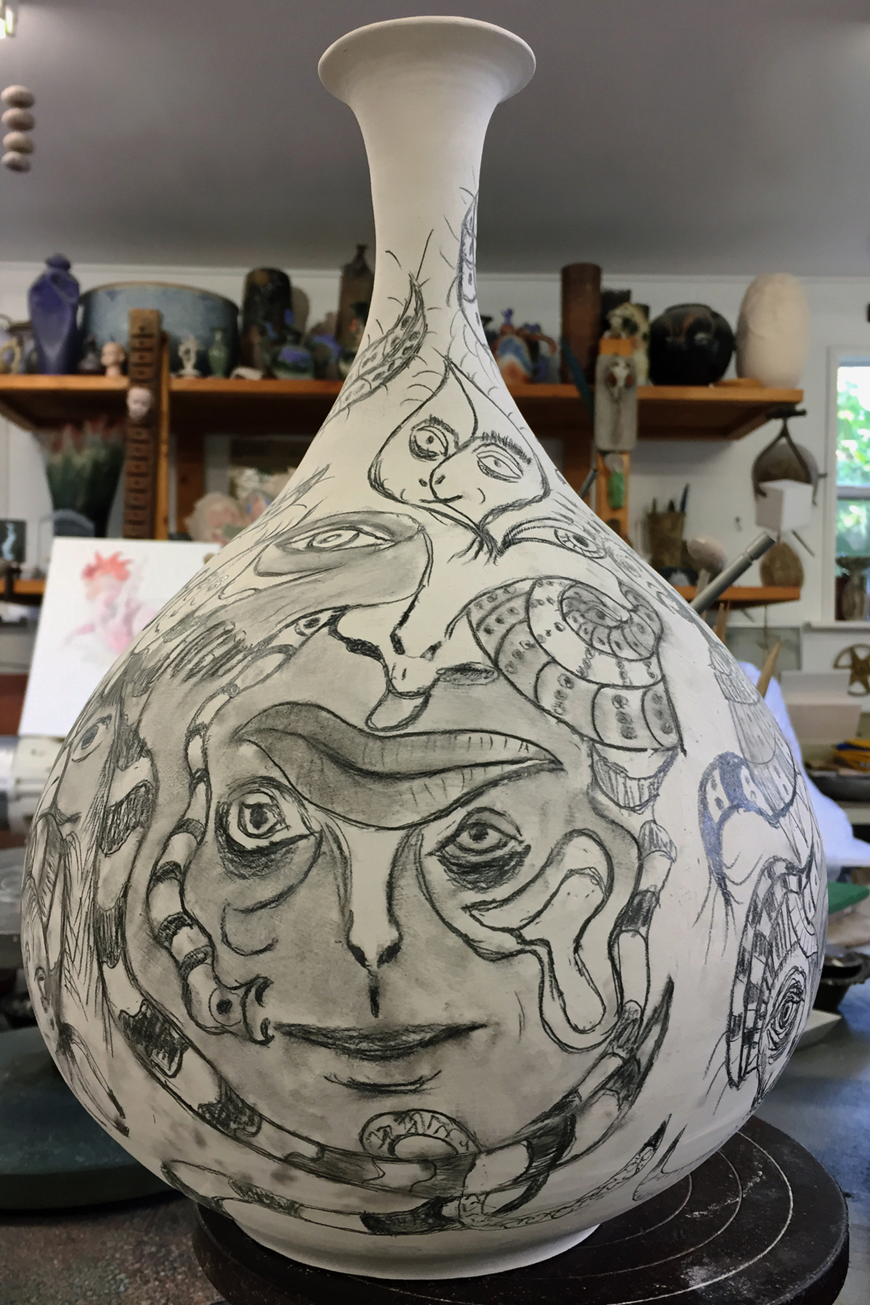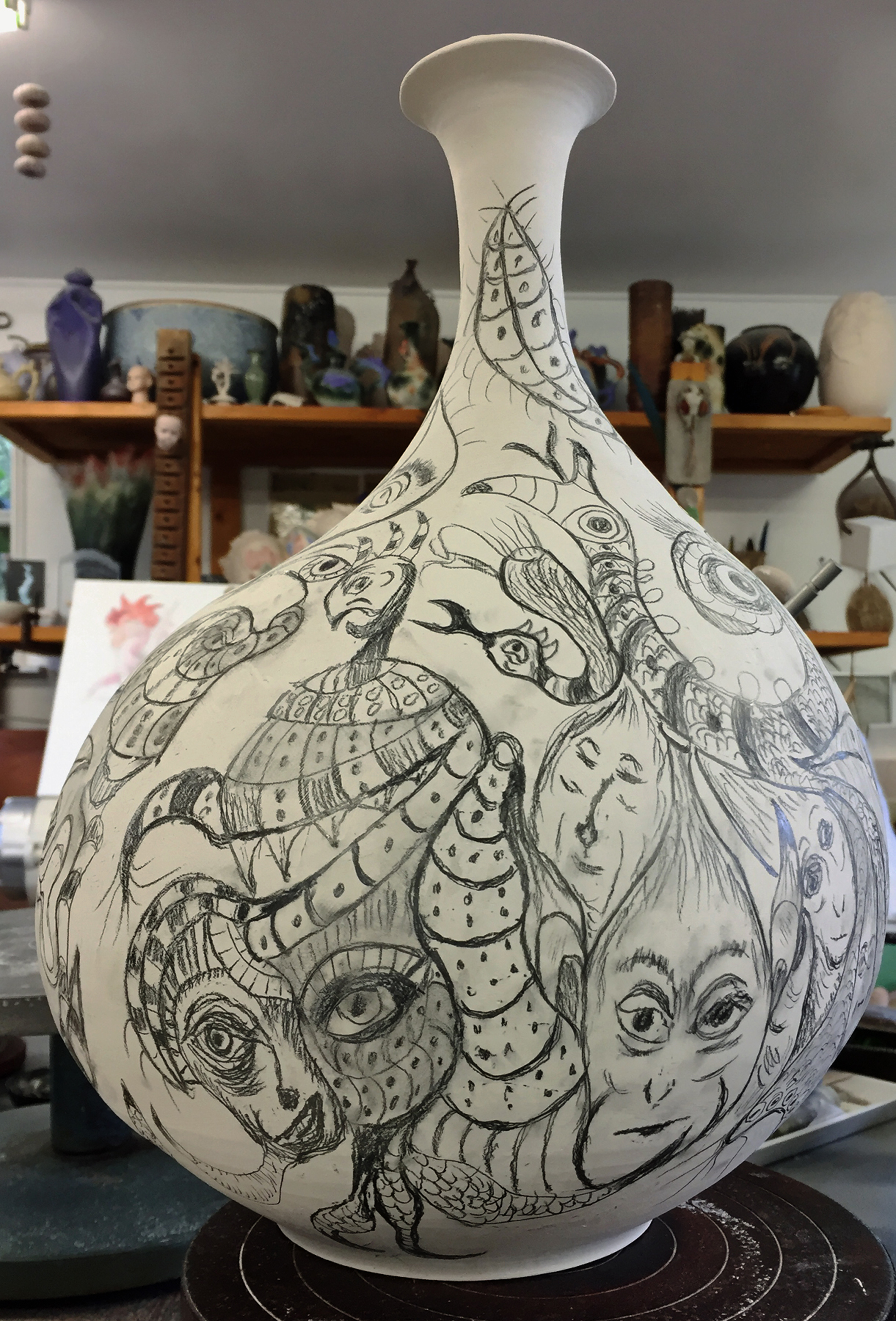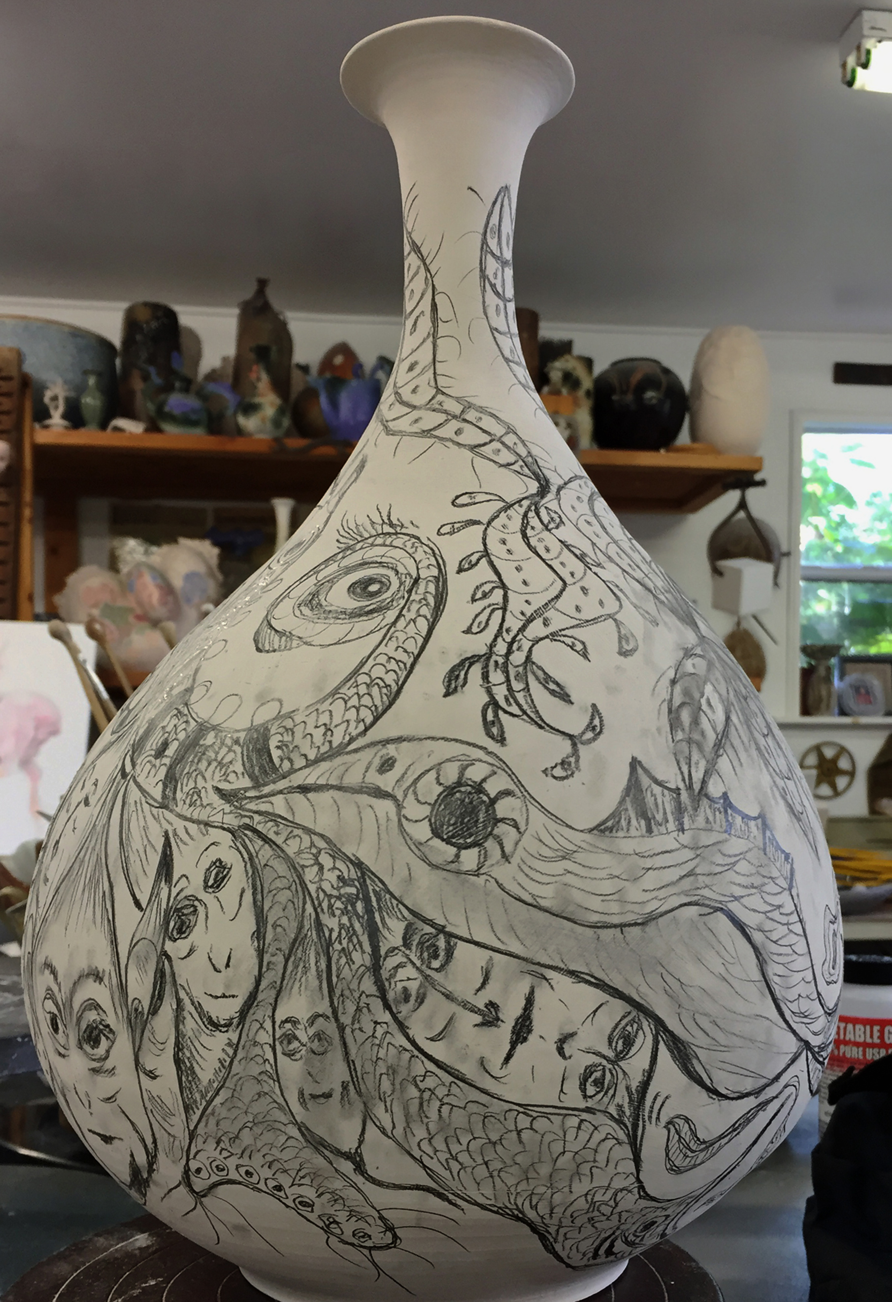 After I finished painting Kneeling Woman, he asked me to decorate the new Bouteille de Parfum. Because the porcelain was so dry, it was not possible to make a wet transfer from a cartoon drawn on calque, I had to draw the cartoon freehand directly on the clay with a pencil.  The drawings are different than the first version and are derived from newer pen, ink & wash drawings from my Night Book series. Below are the four views of the new Bouteille de Parfum with the cartoon drawn on the clay. The piece is a little smaller than the original. It is ~12″ wide and 16″ tall.