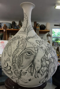 After Ki Woon Huh, my Korean master ceramics teacher accidentally broke my laboriously constructed and painted piece, Bouteille de Parfum,  he made a copy from my drawings. My version was slab made, Ki Woon used the wheel and expertly bent the clay into the complex shape. The result was a much lighter piece which has been drying for five months in the studio.