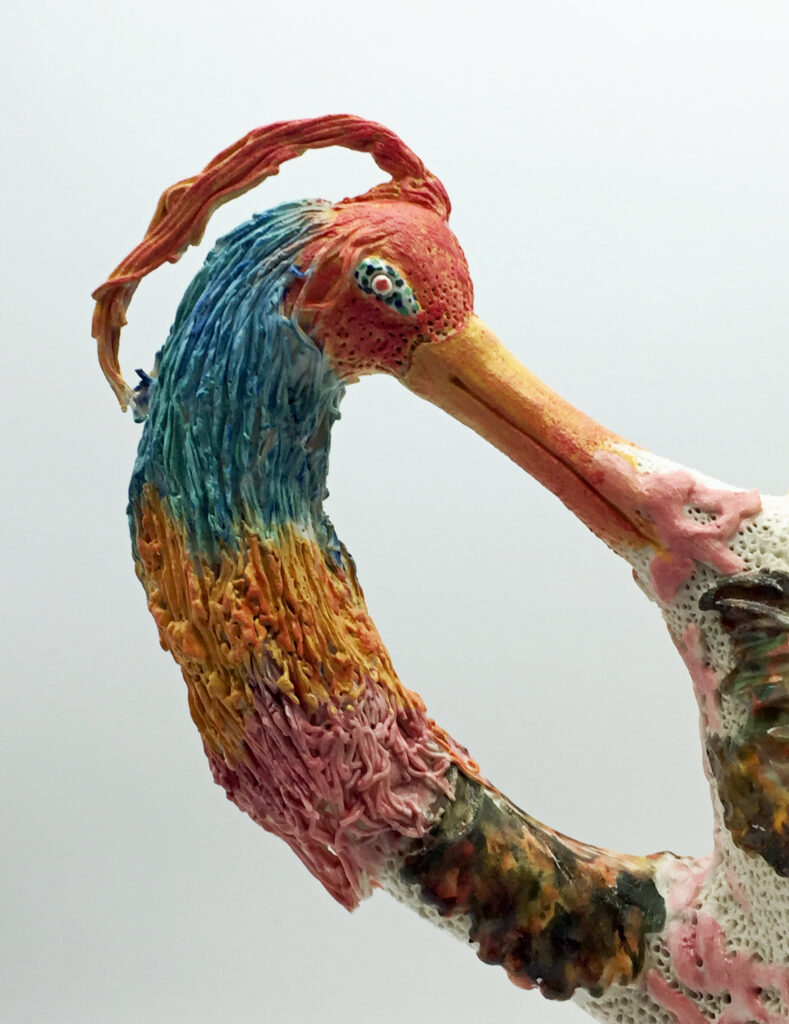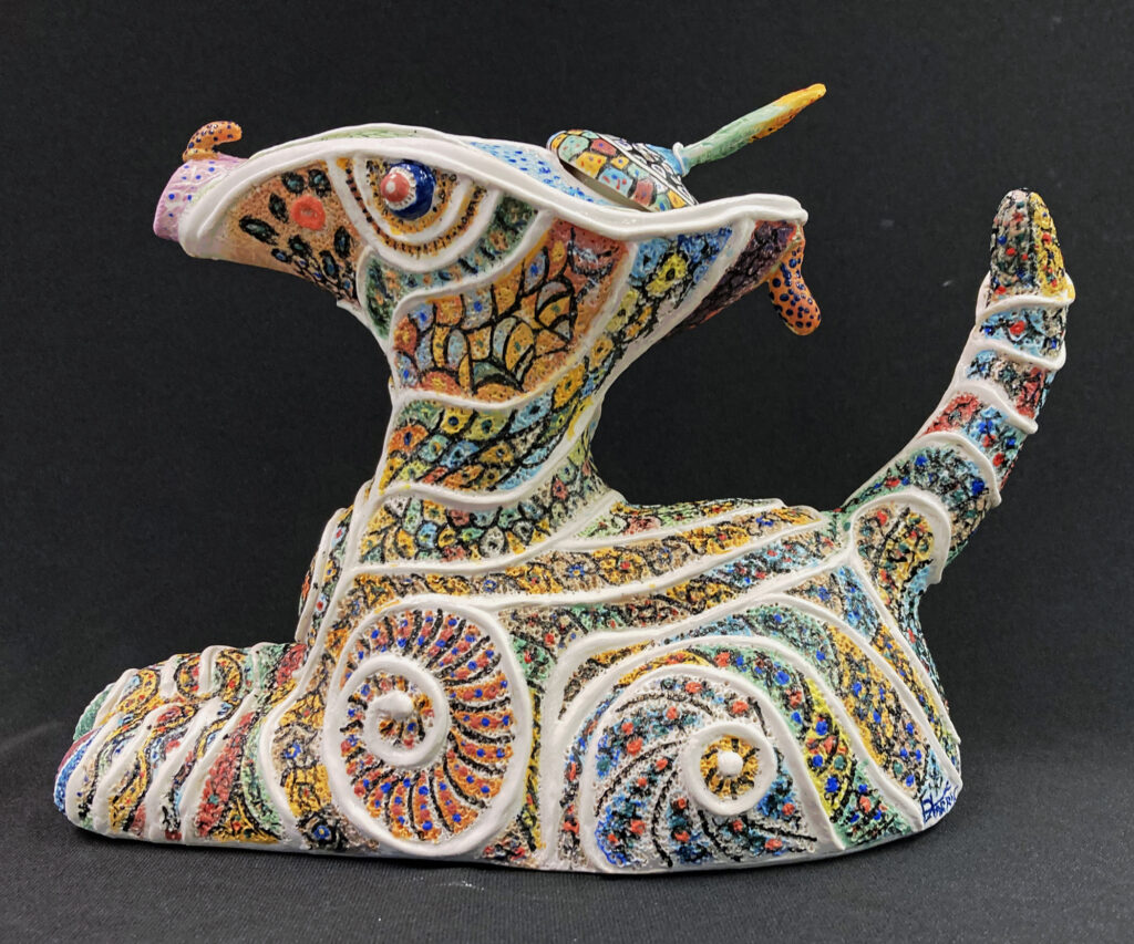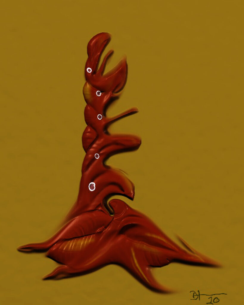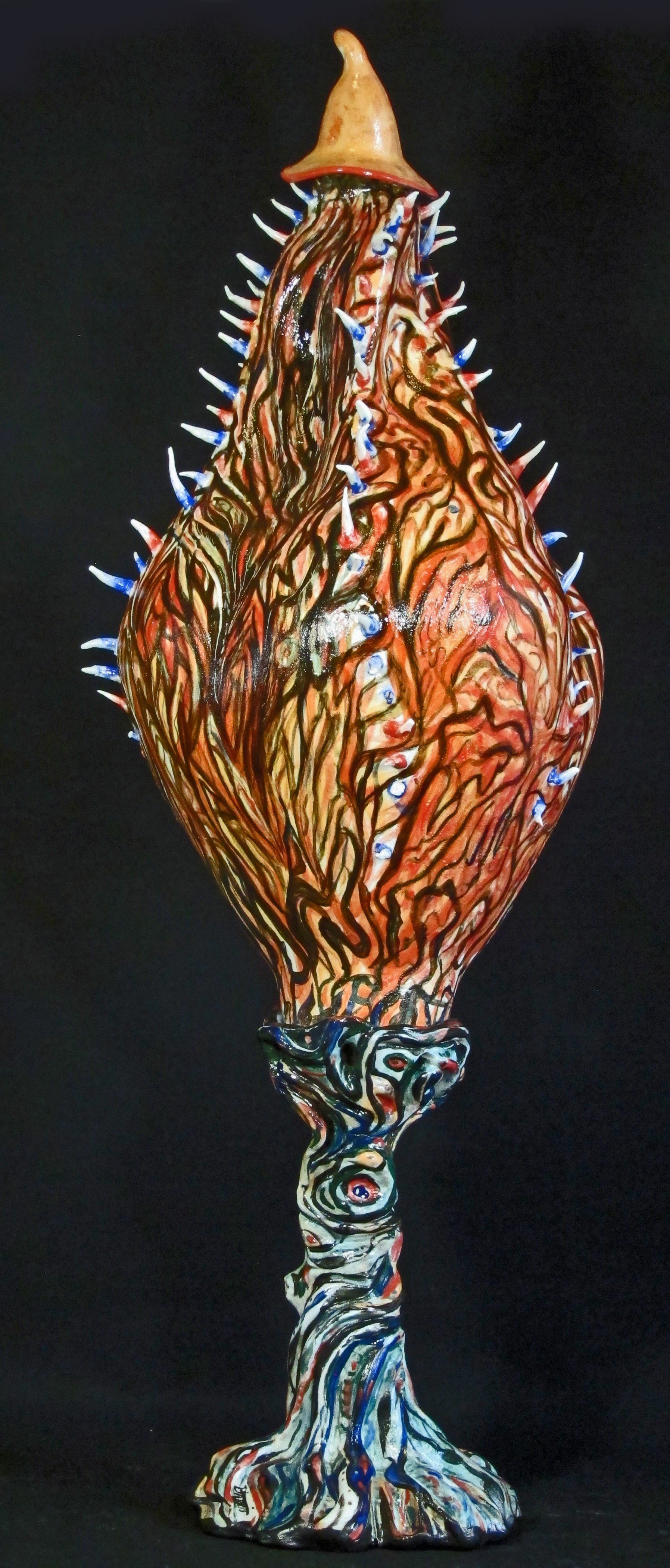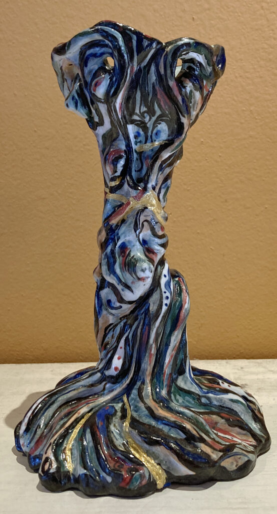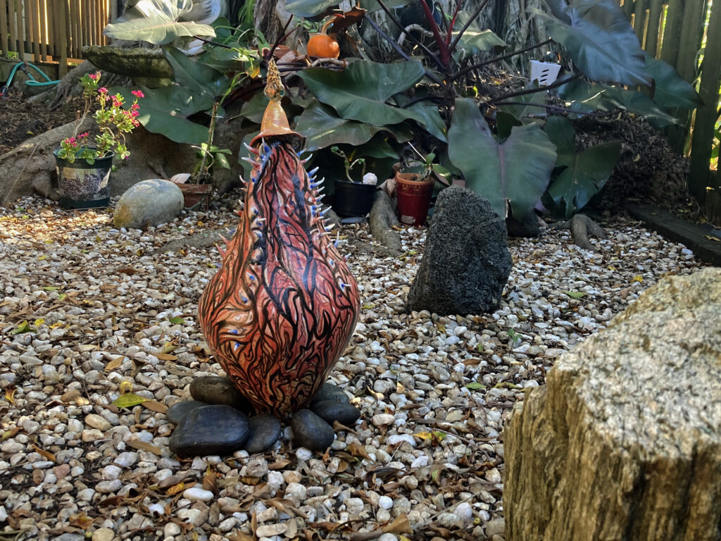 My porcelain maquette for a 25-foot sculpture, Heart of Thorns, was damaged while in transit to my January solo gallery exhibit. It stands alone without its base. I could not repair the lost and damaged thorns, but I added a new jeweled top from my wife’s discarded costume earrings. I put it among the “monoliths” in my zen garden. I hope the local wildlife will not destroy it. Raccoons, opossums, squirrels, and the many birds that bathe and drink in my fountain may find it irresistible to use as a scratching post or playtoy.