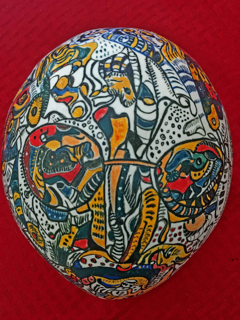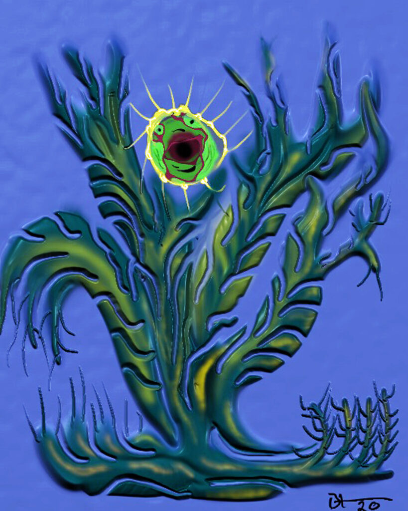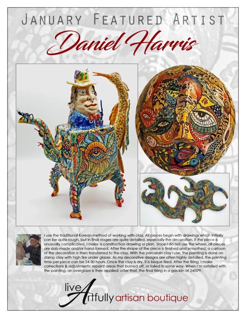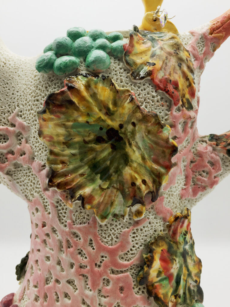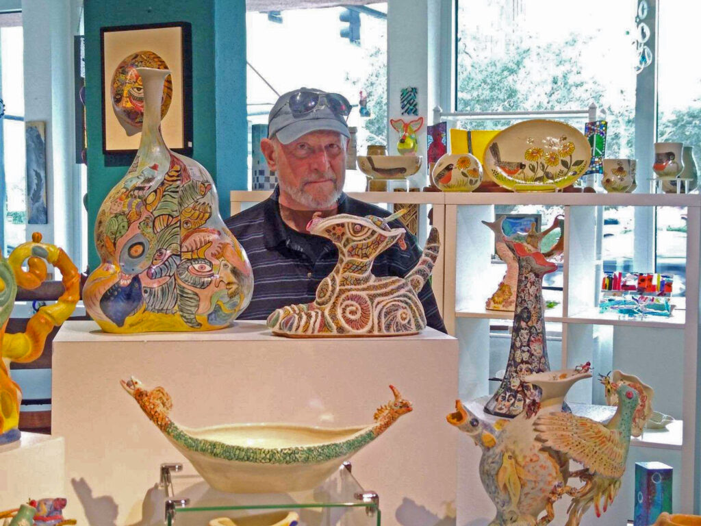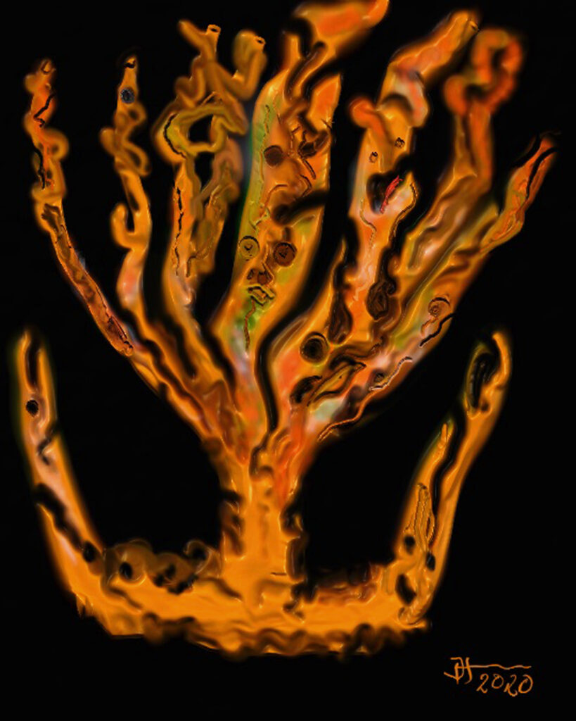 My porcelain maquette for a 25-foot sculpture, Heart of Thorns, was damaged while in transit to my January solo gallery exhibit. It stands alone without its base. I could not repair the lost and damaged thorns, but I added a new jeweled top from my wife’s discarded costume earrings. I put it among the “monoliths” in my zen garden. I hope the local wildlife will not destroy it. Raccoons, opossums, squirrels, and the many birds that bathe and drink in my fountain may find it irresistible to use as a scratching post or playtoy.