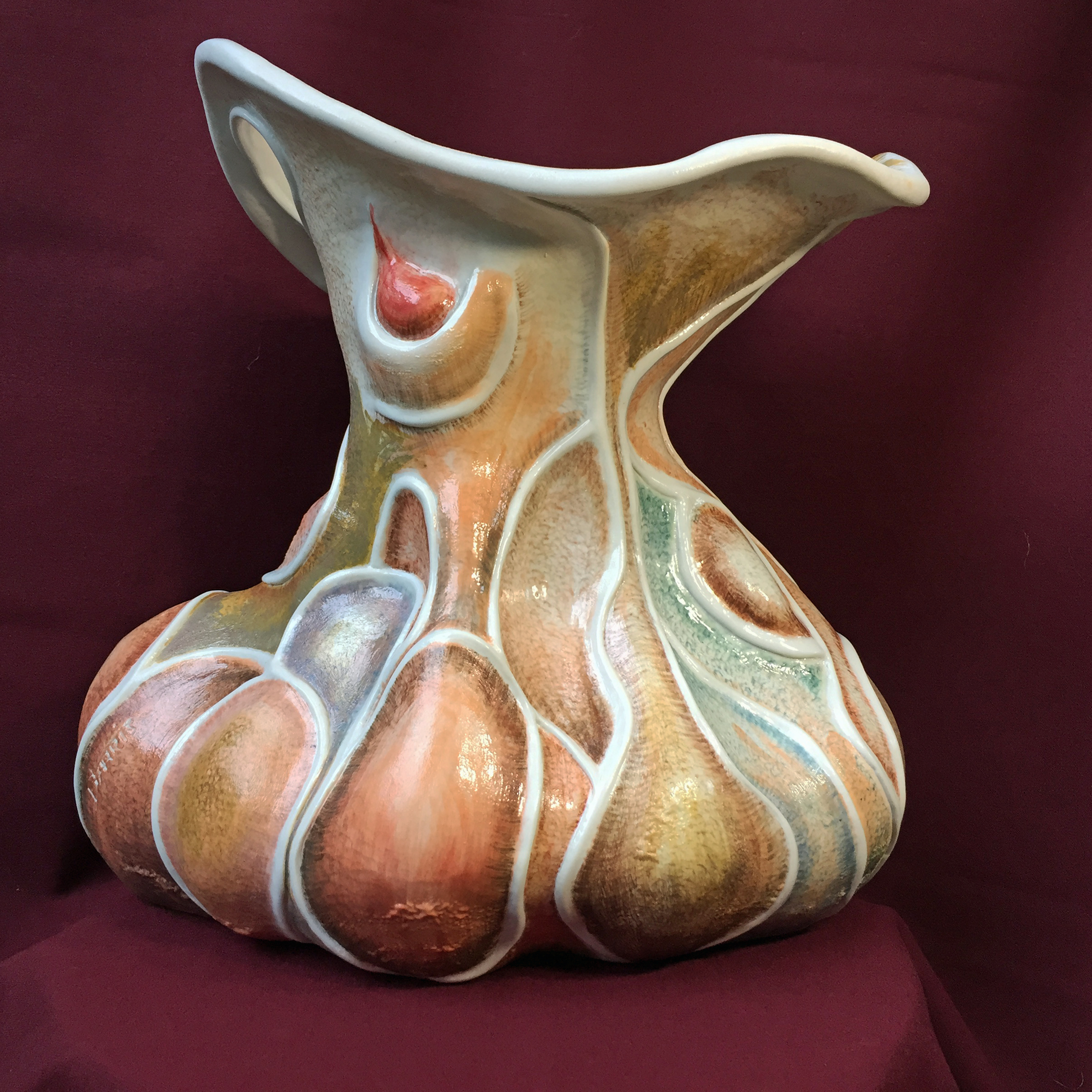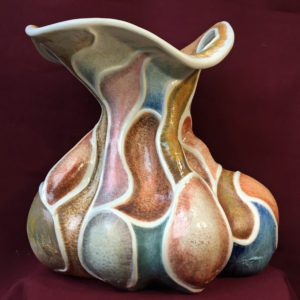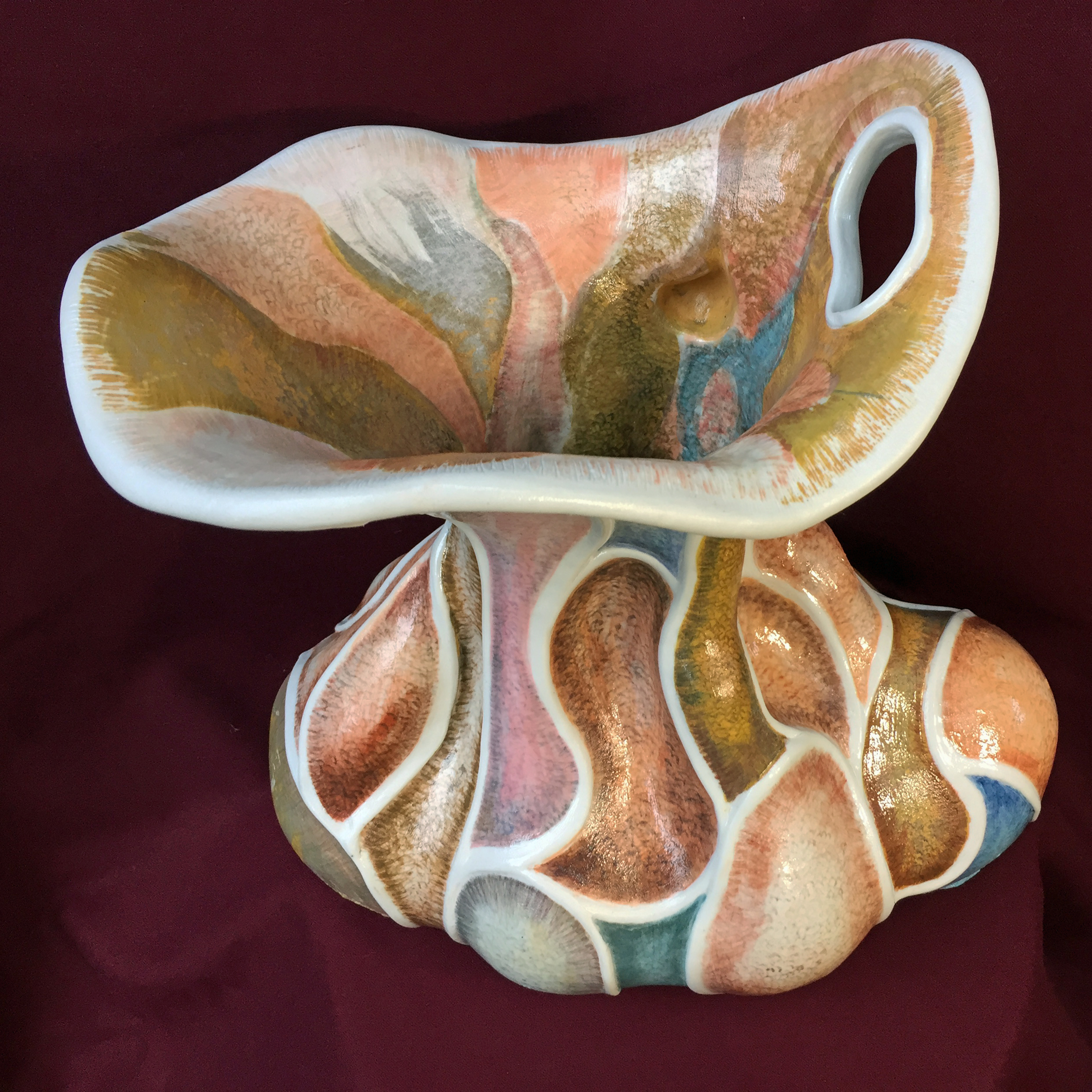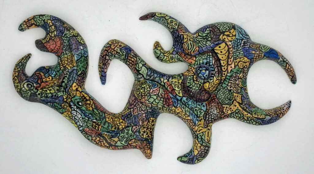 A painted porcelain hanging sculpture. Designed, handmade, and painted from drawings and color scheme sketches. 14Wx9Hx2″D