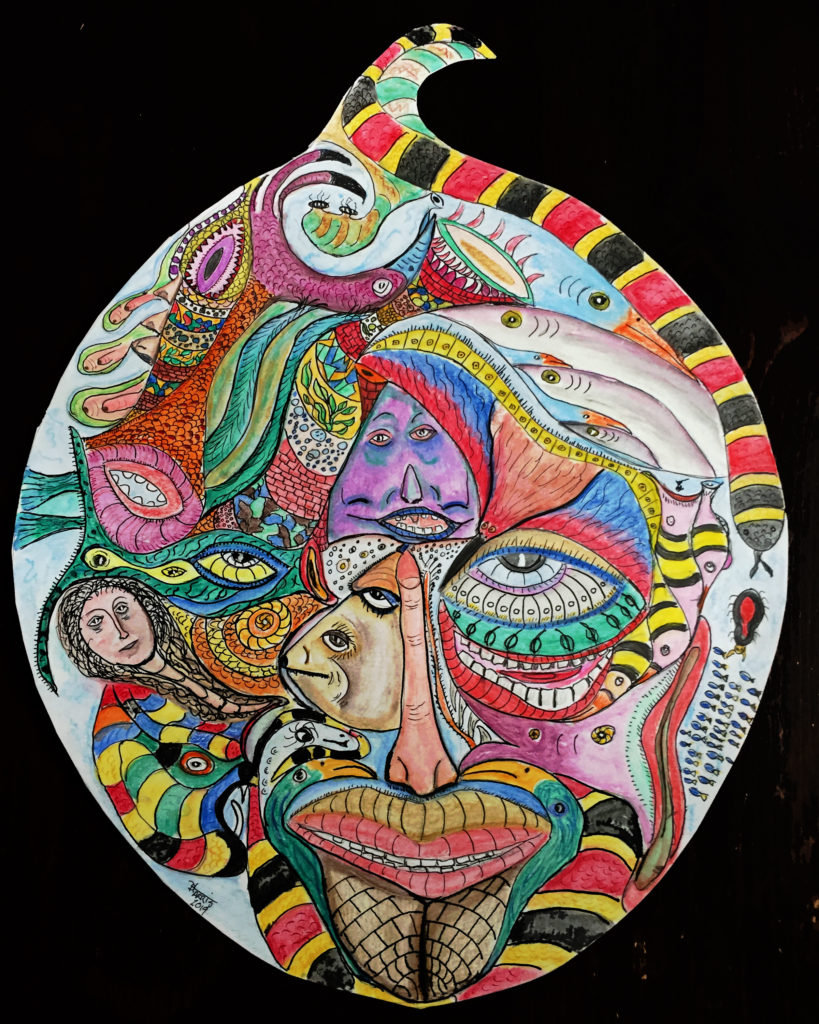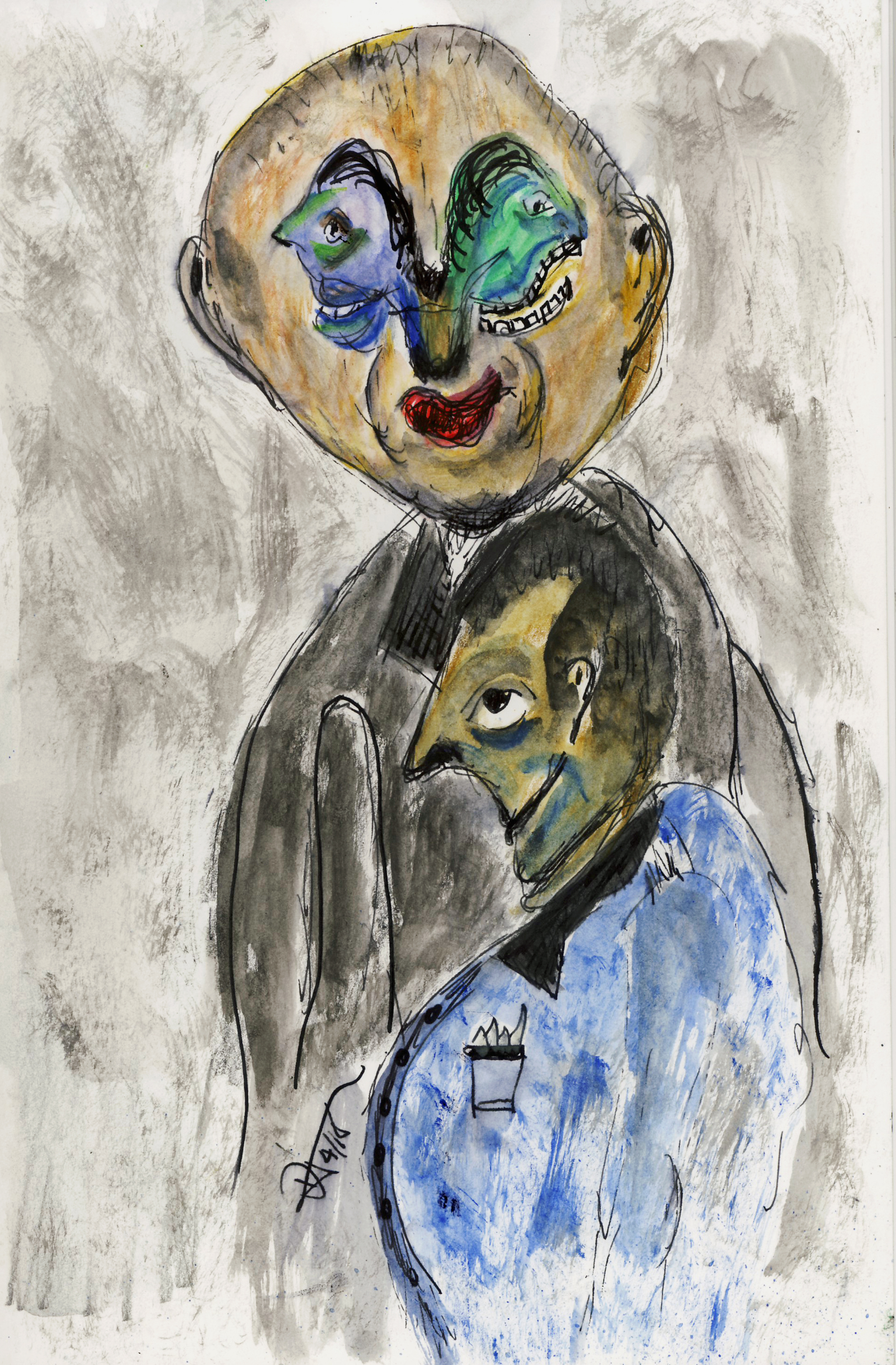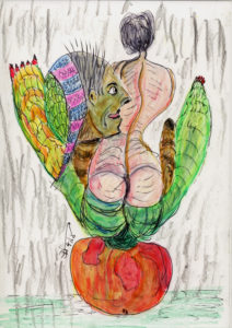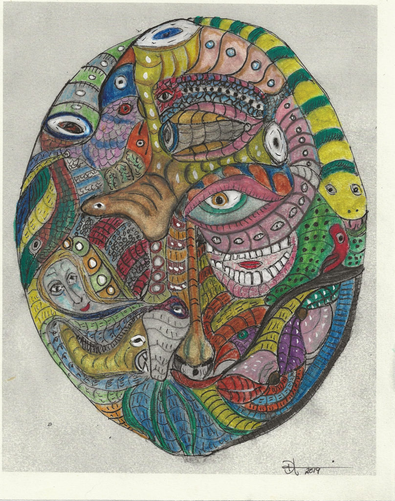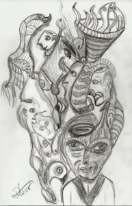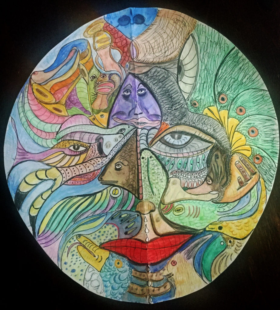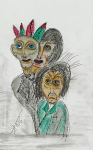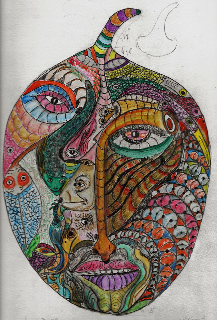 These are colored sketches for a new porcelain mask project. It will be similar to the Mask as Self Portrait project, but are intended to be “story masks.” They are made using Aquarelle pencils, water brush, dip pens and color India inks.