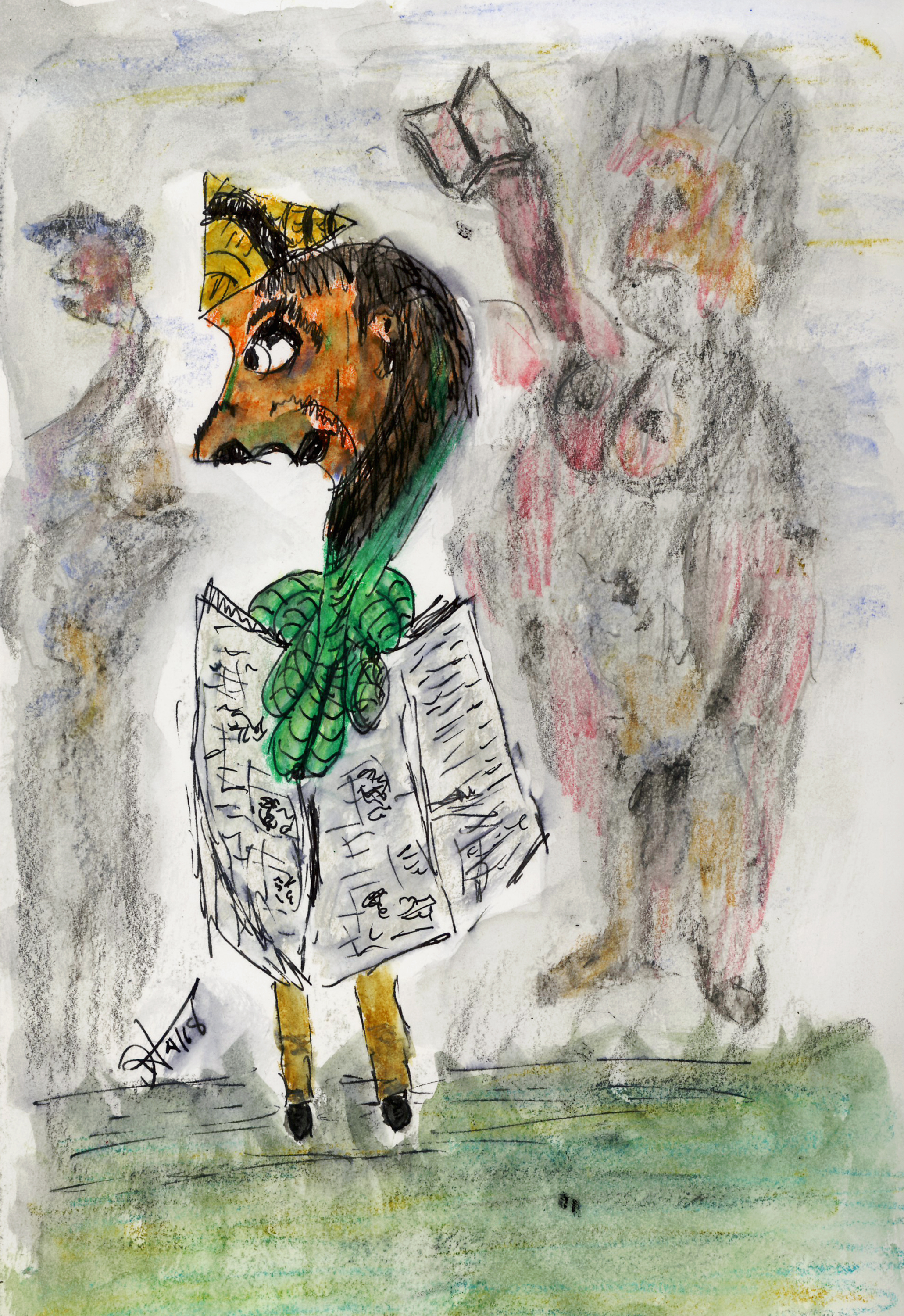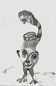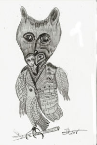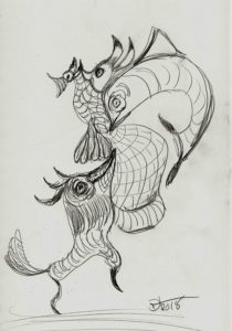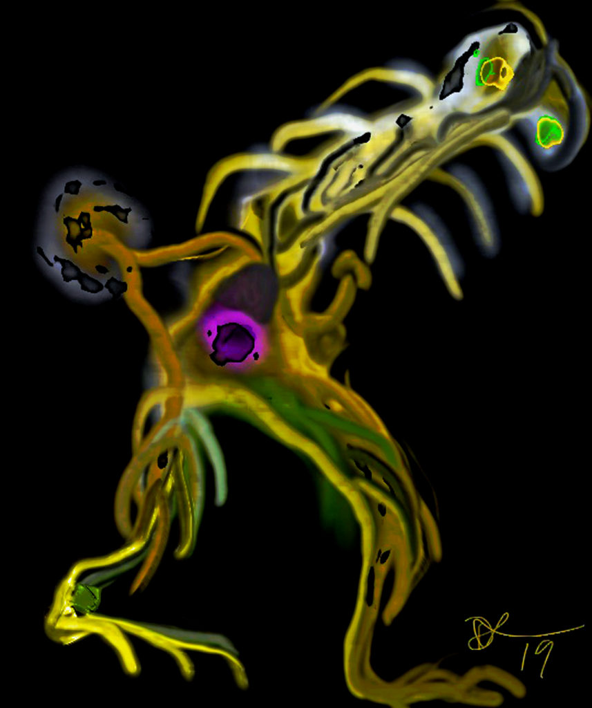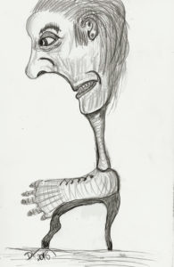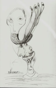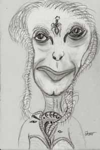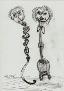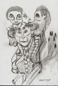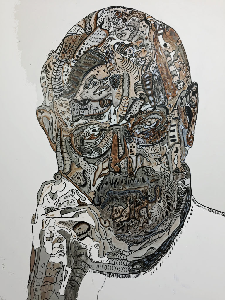 Speedball 102/107 dip pens, Dr. Phil. Martin Black, Van Dyke Brown and White India ink and washes on 12×16″ Ampersand Claybord. 2019