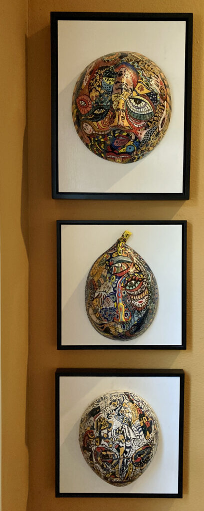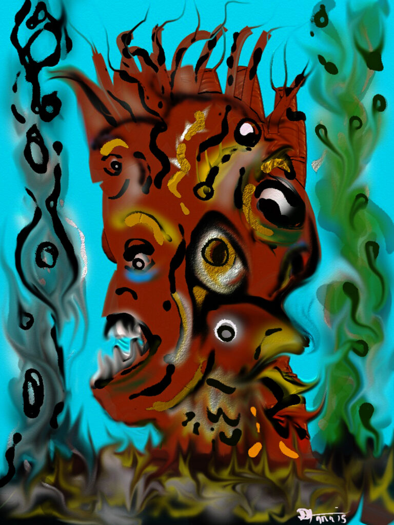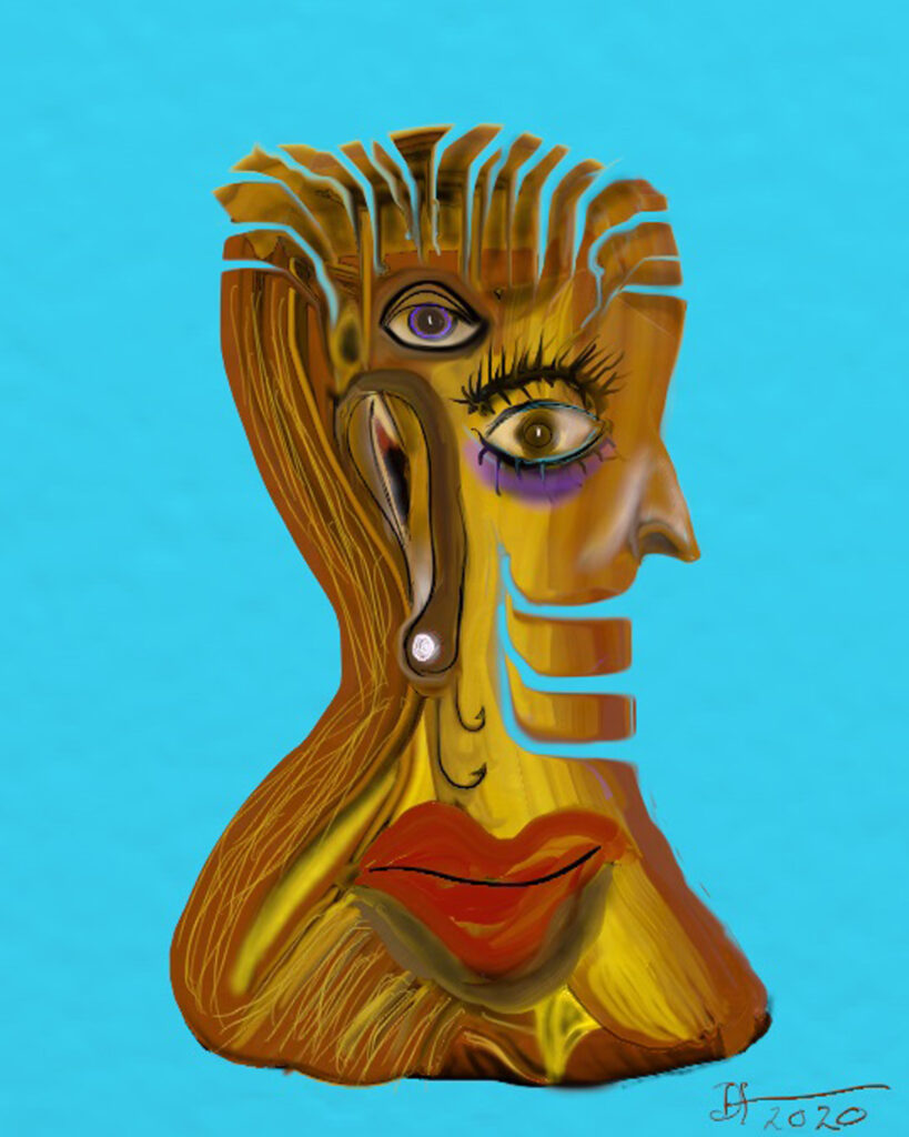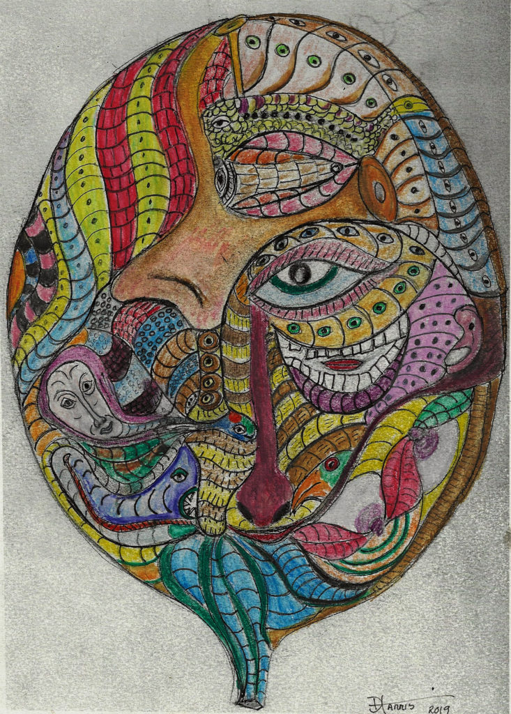 Most of the head paintings were made on iPhone or iPad using various painting apps. The impetus to use digital mobile devices to make art came from Mr. Harris’s longtime friend and colleague, Patricio Villarroel-Bórquez, a legendary musician and artist based in Paris.