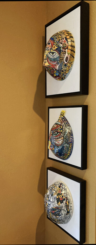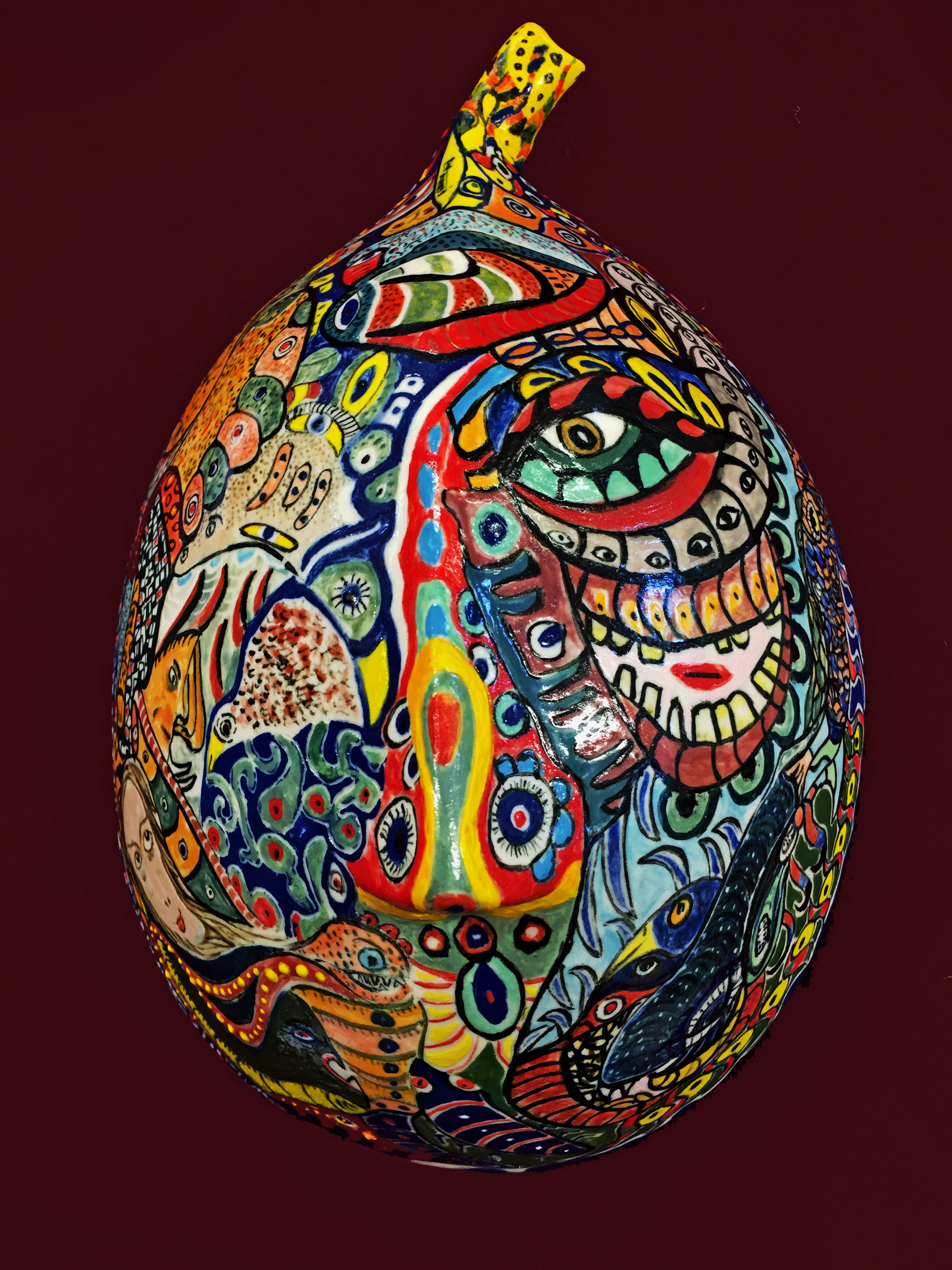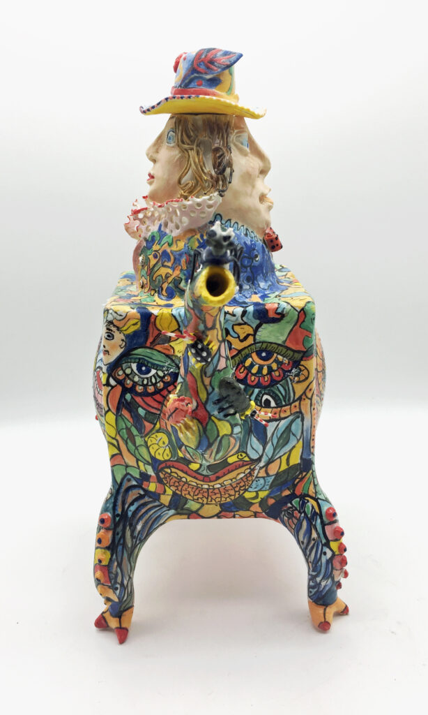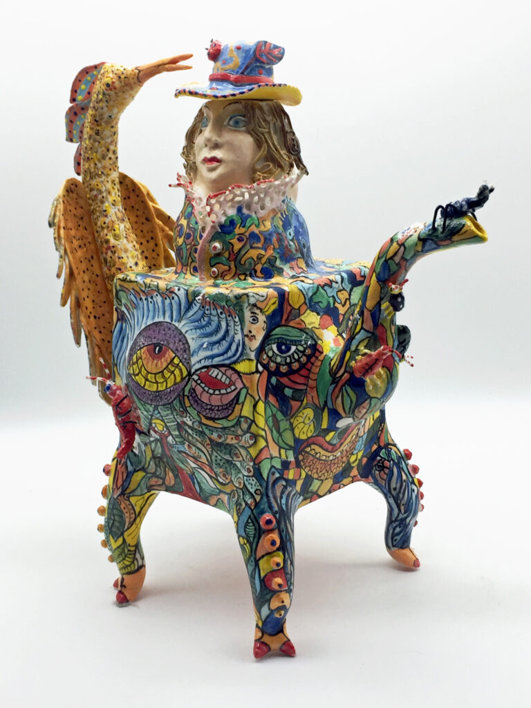 Three-dimensional mask, My design, hand made and painted. High-fire porcelain. 10″H x 8W x 5D (25.5cm x 7.9 x 12.7)