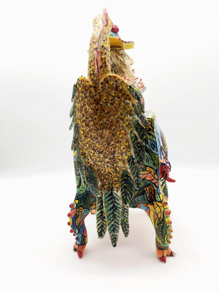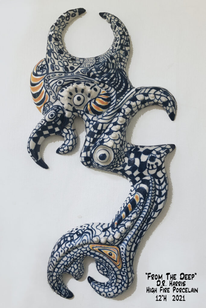 Hanging sculpture: Porcelain. Original design, Handmade and painted, high fired. 11.5″H x 5.5W x 1.5″D