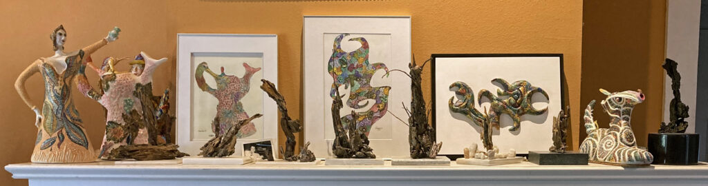 Sculptures, pottery, paintings, and drawings on my living room fireplace mantle.