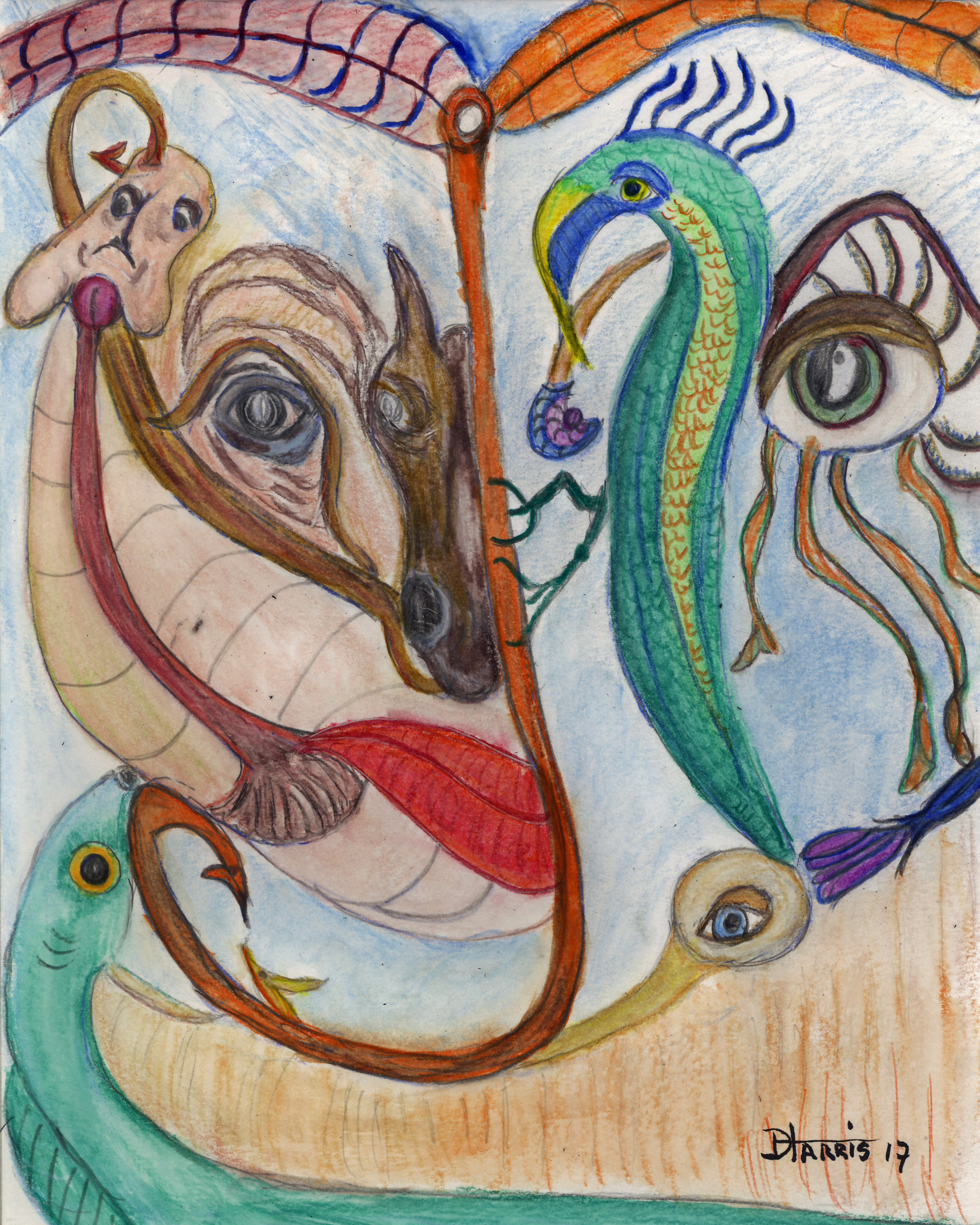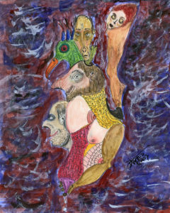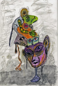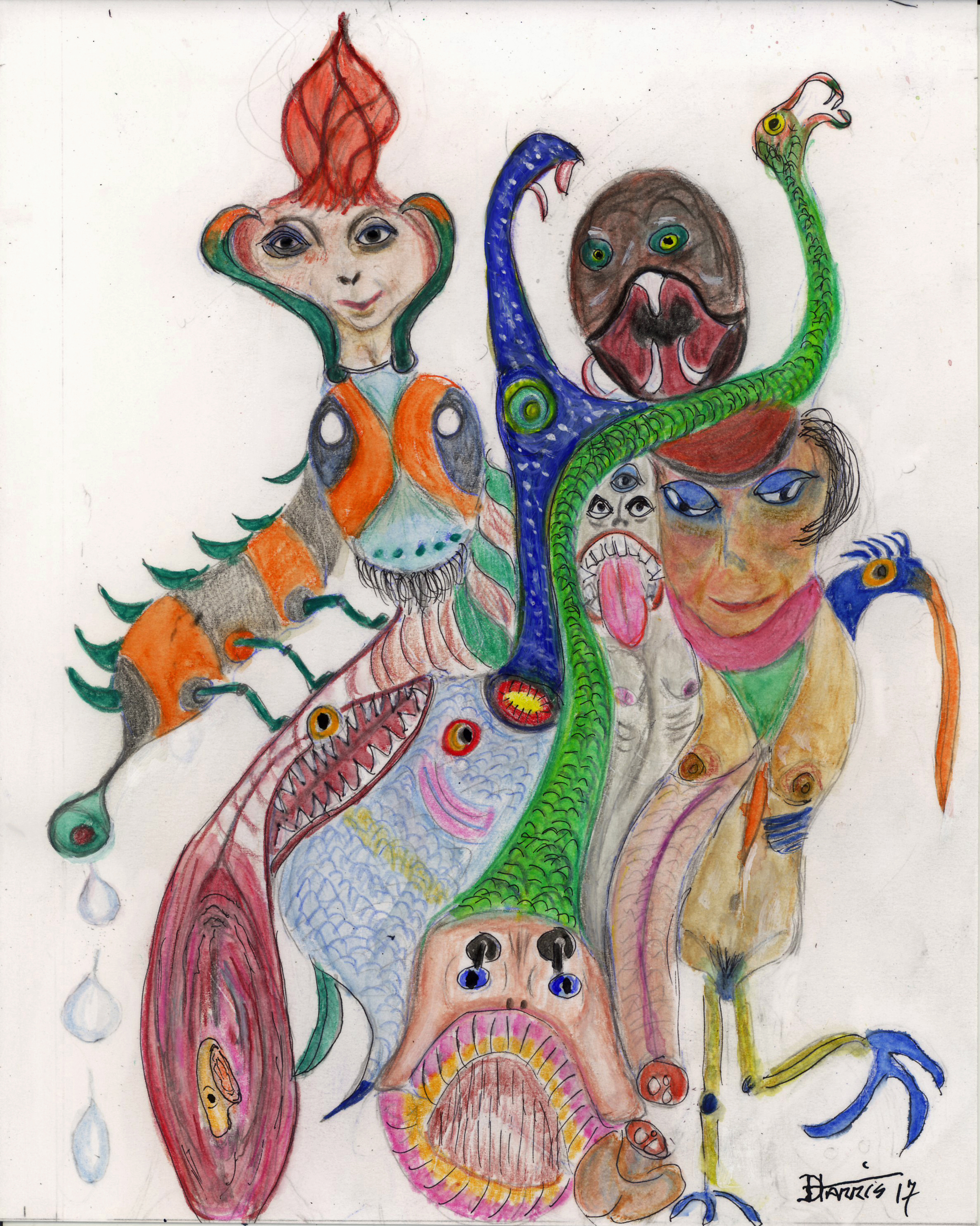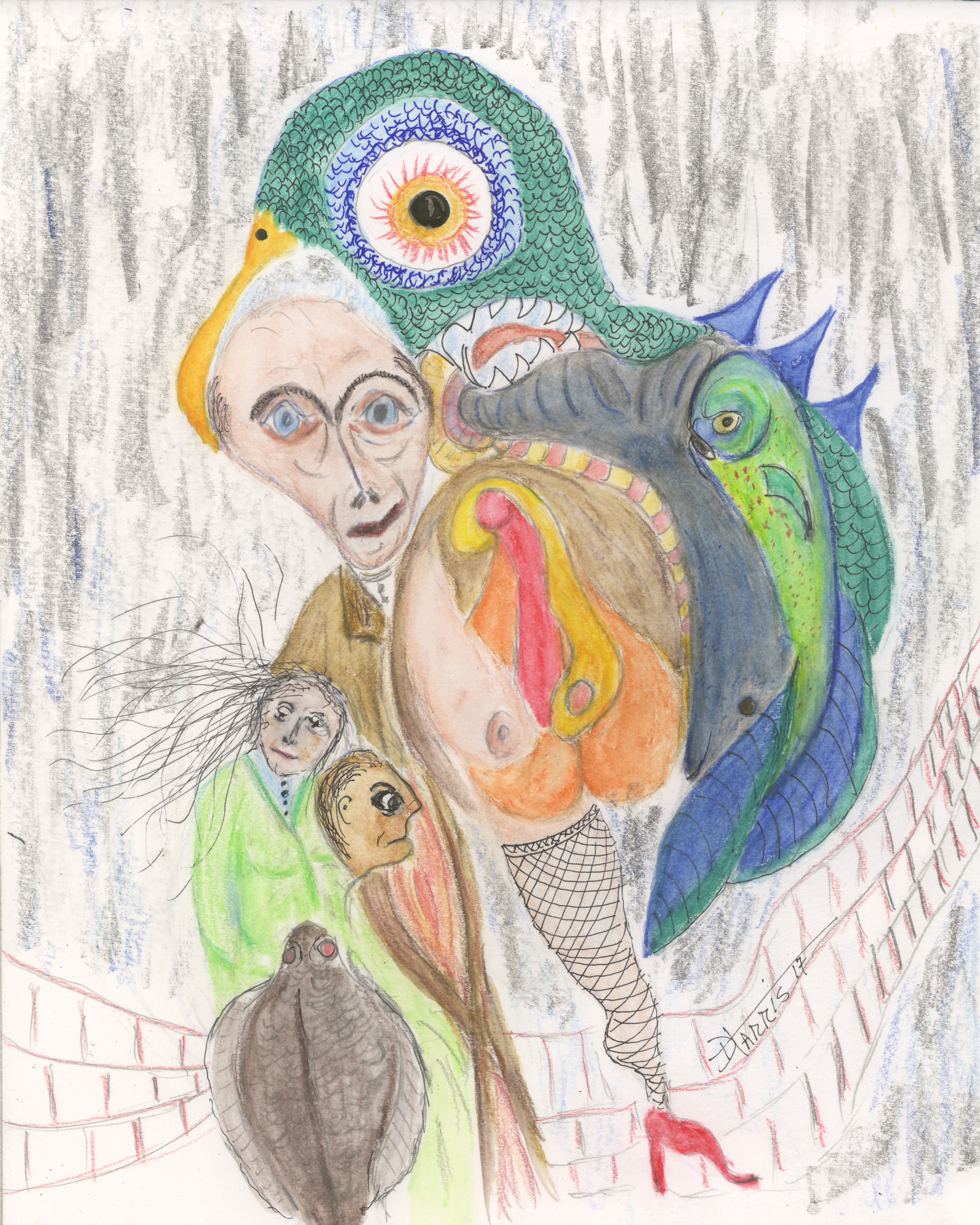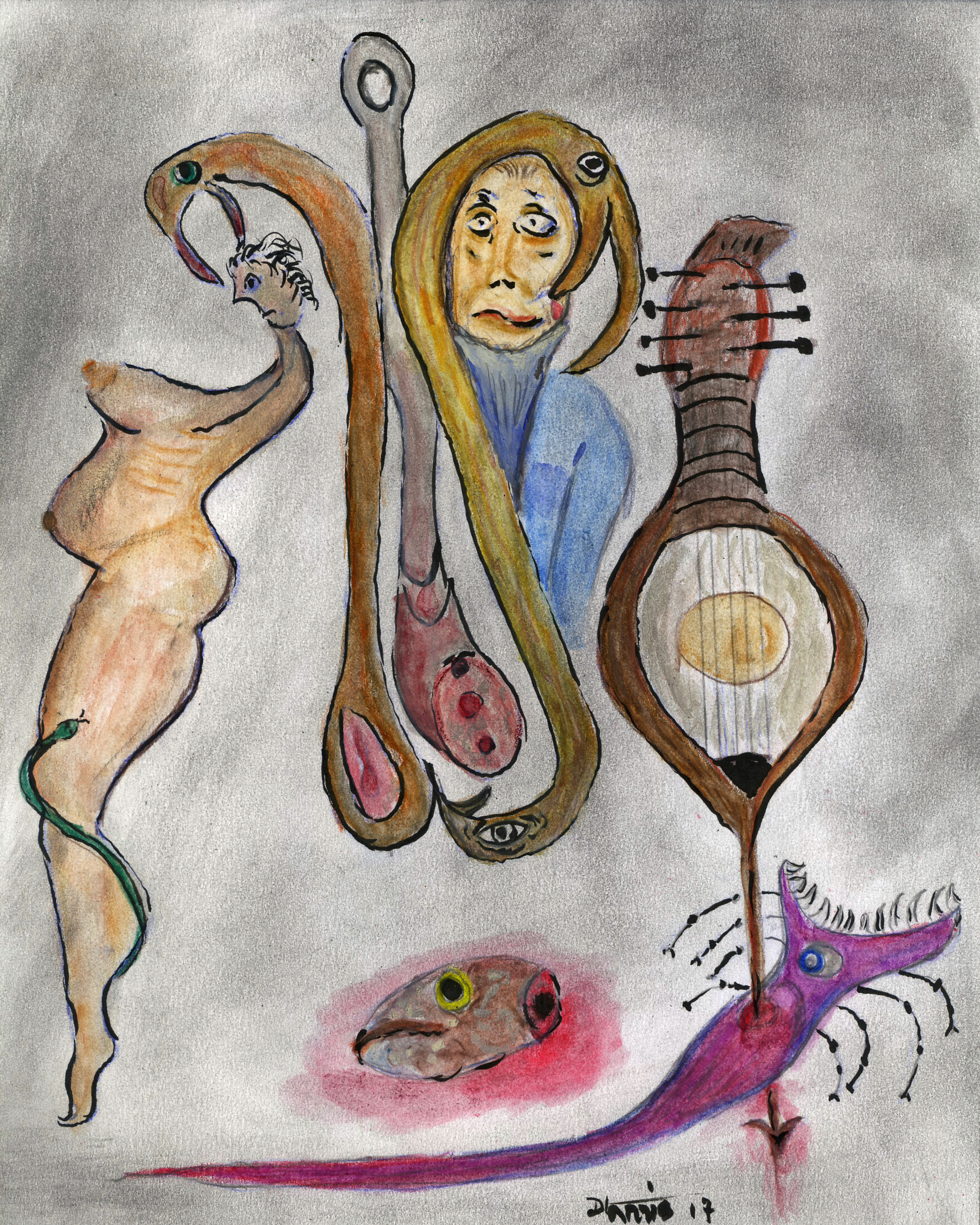 The Night Book is a folio of mixed-media paintings: pencil, ink, watercolor, Aquarelle pencil & acrylic. The paintings began as pencil, later ink, drawings made in my bedside Moleskine and Stillman & Birn sketchbooks while in that zone between wakefulness and sleep, A world devoid of reason but rich in images: half-formed, unrelated, surreal, erotic, even terrifying. A critic likened my phantasmagoric paintings to graphic poetry. Inspiration for the Night Book project came from Goya’s Los Caprichos (1799), and from François Desprez’s (1655) and Gustave Doré’s (1854) illustrations for Rabelais’s Pantagruel (1655), in my novel, The Nude Pianist (Fictionaut,­­­ 2016), a few of these paintings appear as the work of Francesco Martinelli.