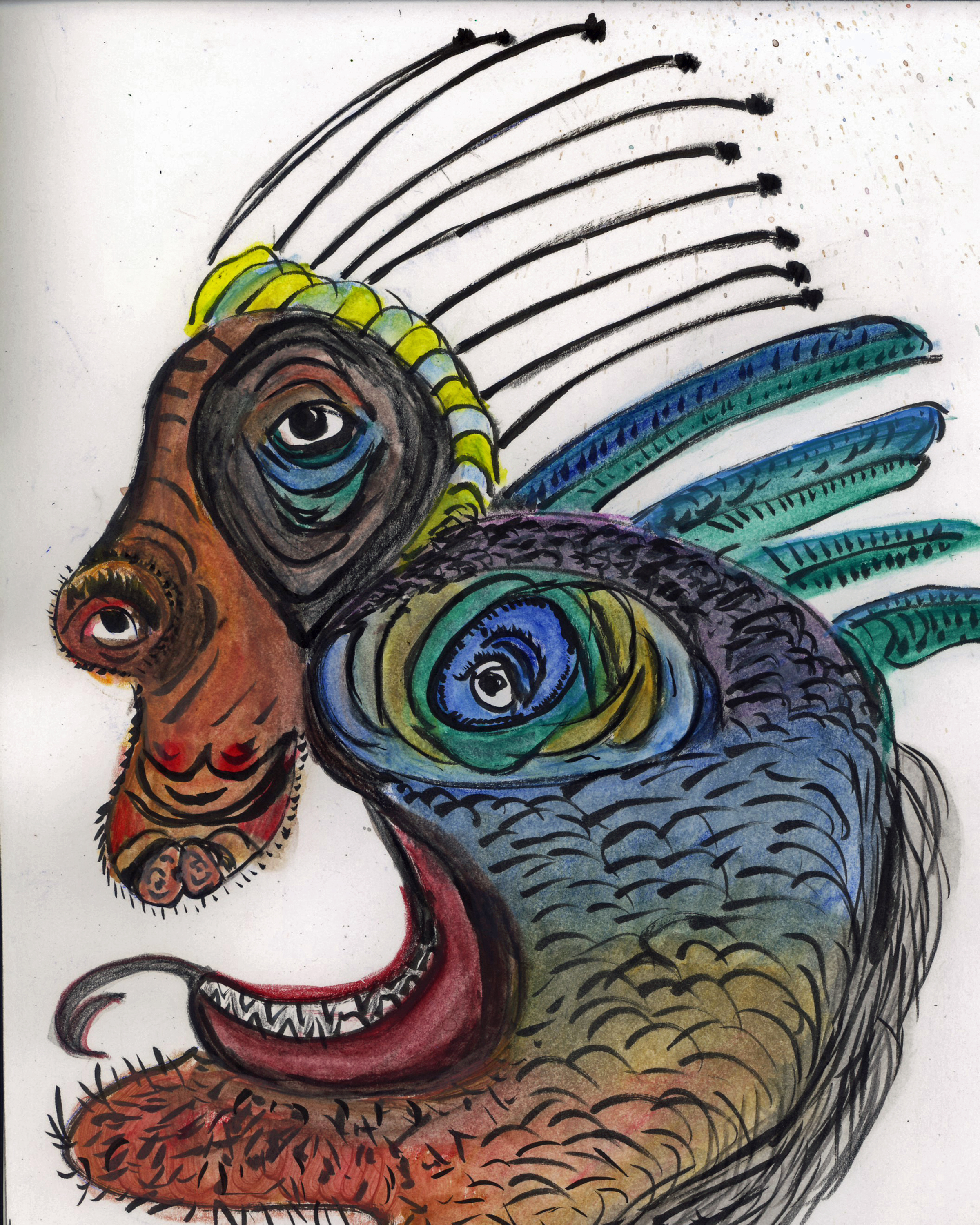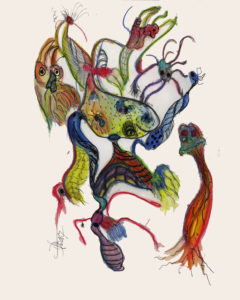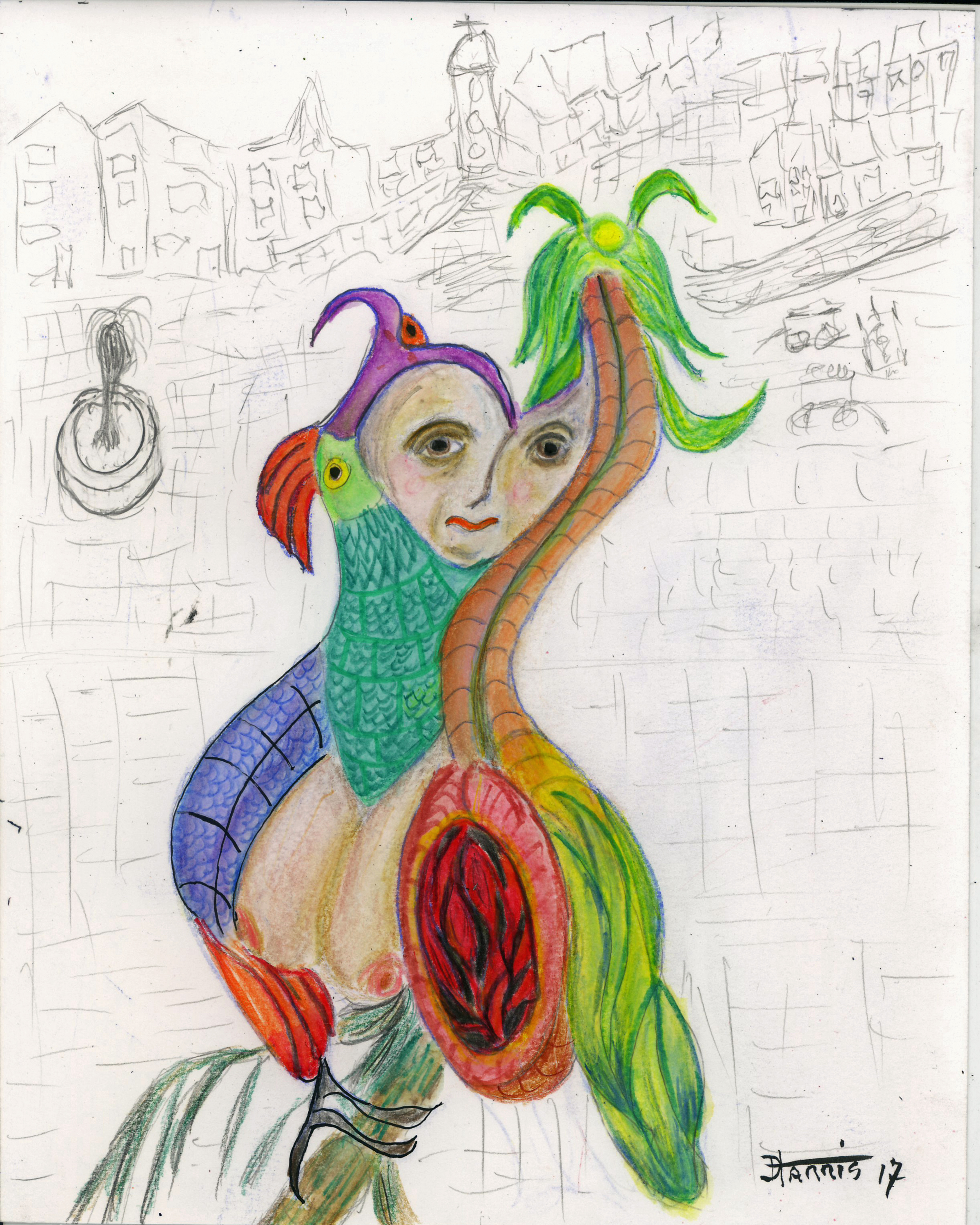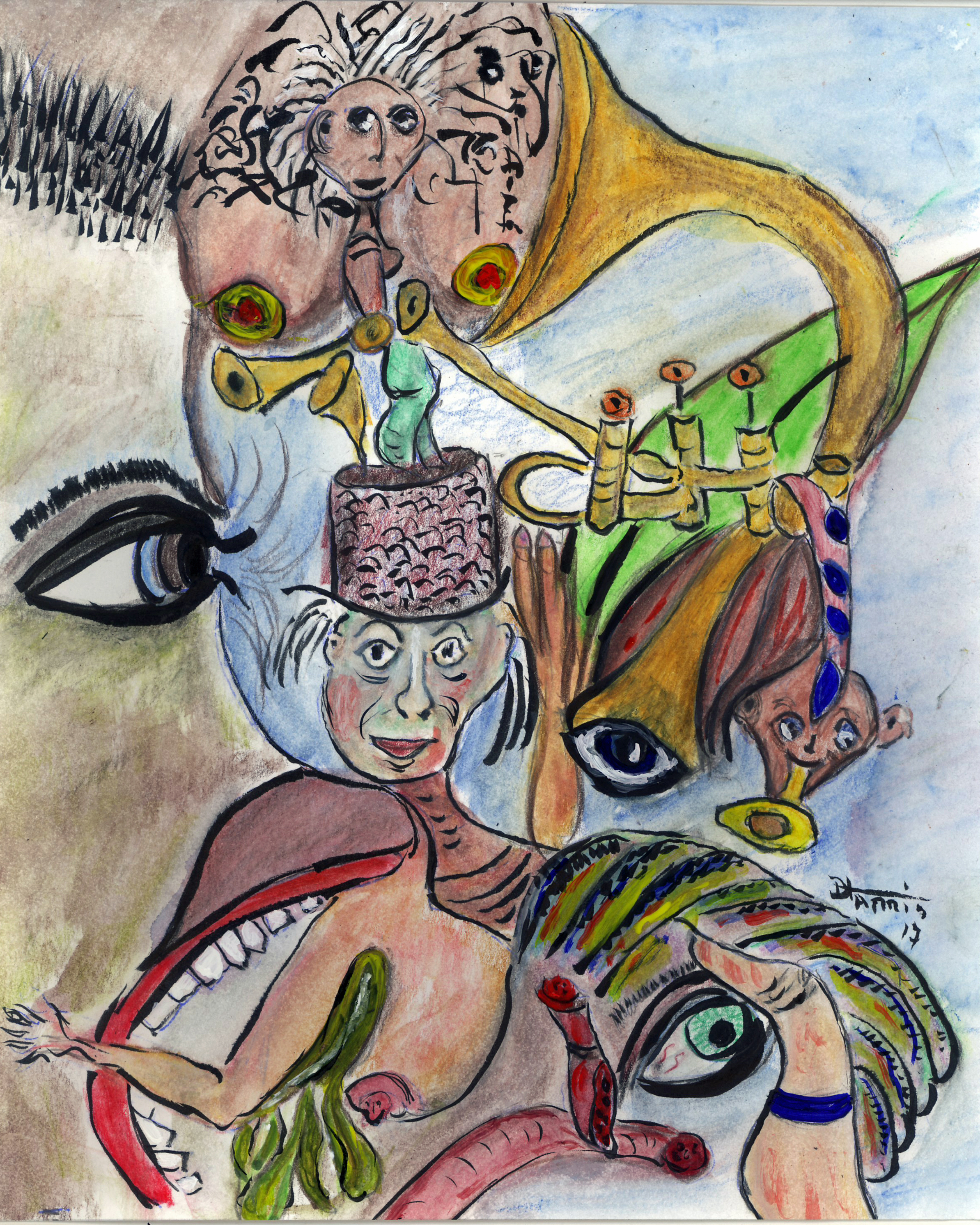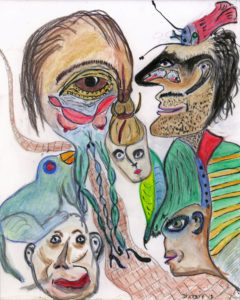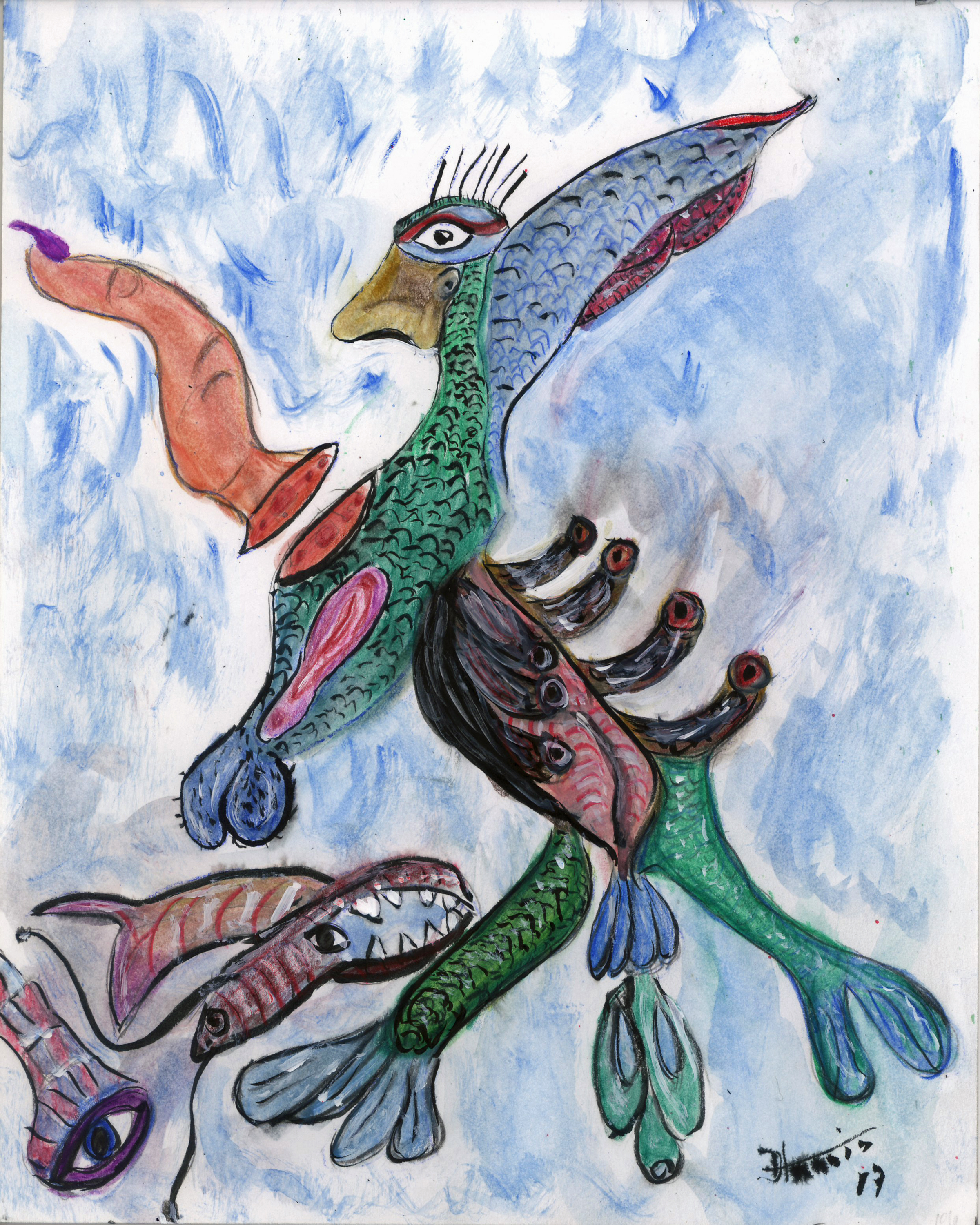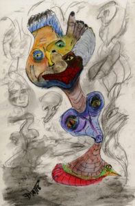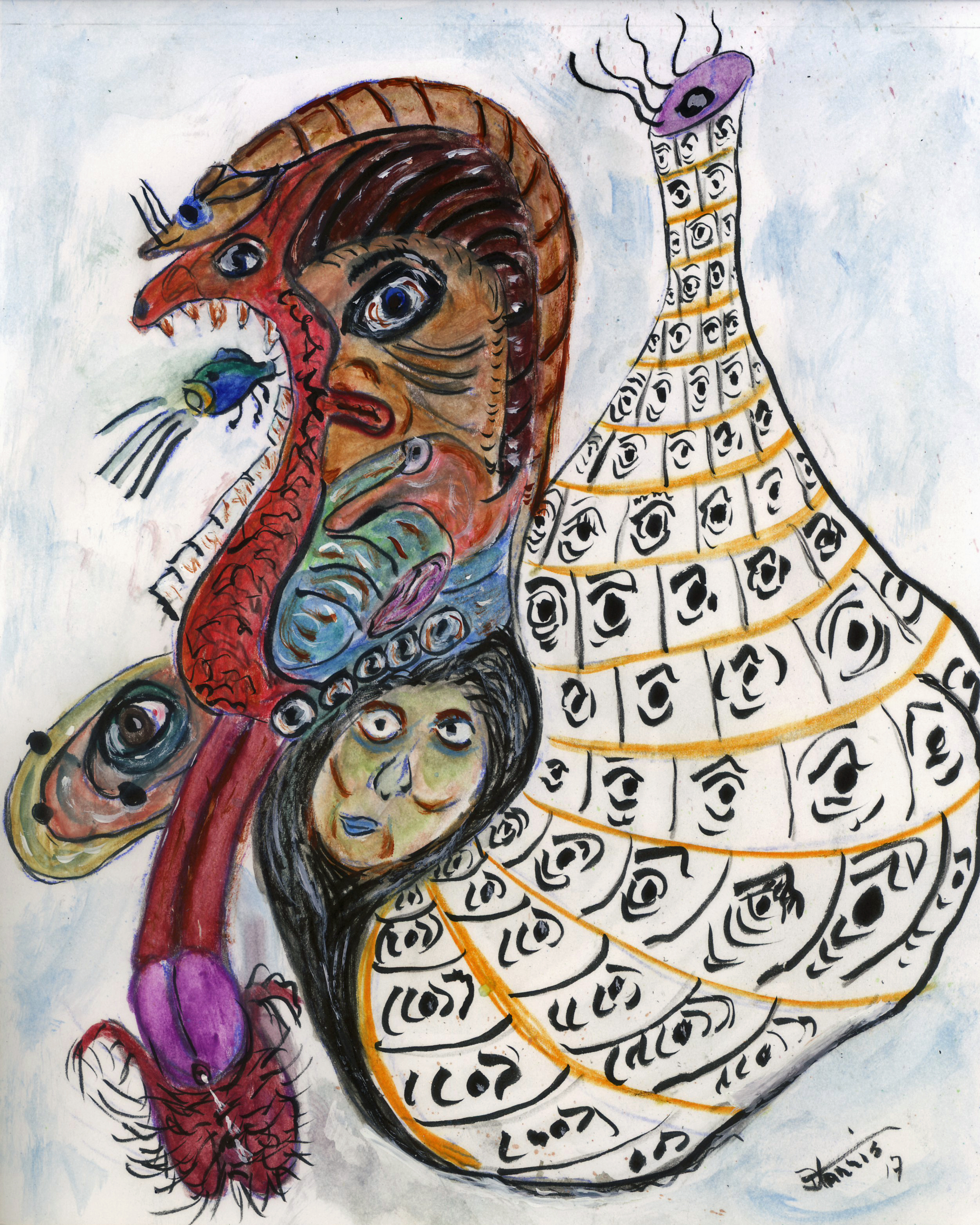 The Night Book is a folio of mixed-media paintings: pencil, ink, watercolor, Aquarelle pencil & acrylic. The paintings began as pencil, later ink, drawings made in my bedside Moleskine and Stillman & Birn sketchbooks while in that zone between wakefulness and sleep, A world devoid of reason but rich in images: half-formed, unrelated, surreal, erotic, even terrifying. A critic likened my phantasmagoric paintings to graphic poetry. Inspiration for the Night Book project came from Goya’s Los Caprichos (1799), and from François Desprez’s (1655) and Gustave Doré’s (1854) illustrations for Rabelais’s Pantagruel (1655), in my novel, The Nude Pianist (Fictionaut,­­­ 2016), a few of these paintings appear as the work of Francesco Martinelli.
