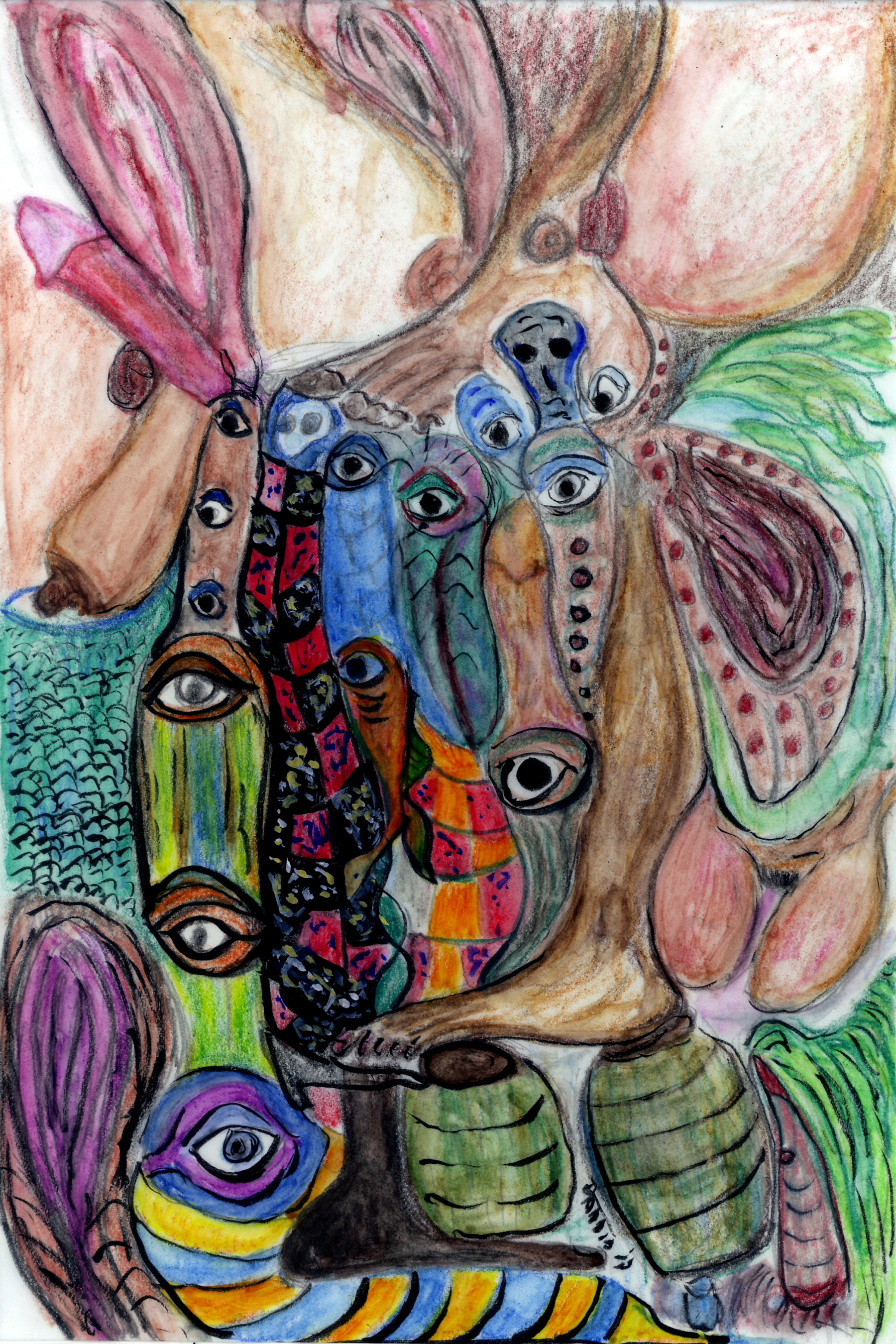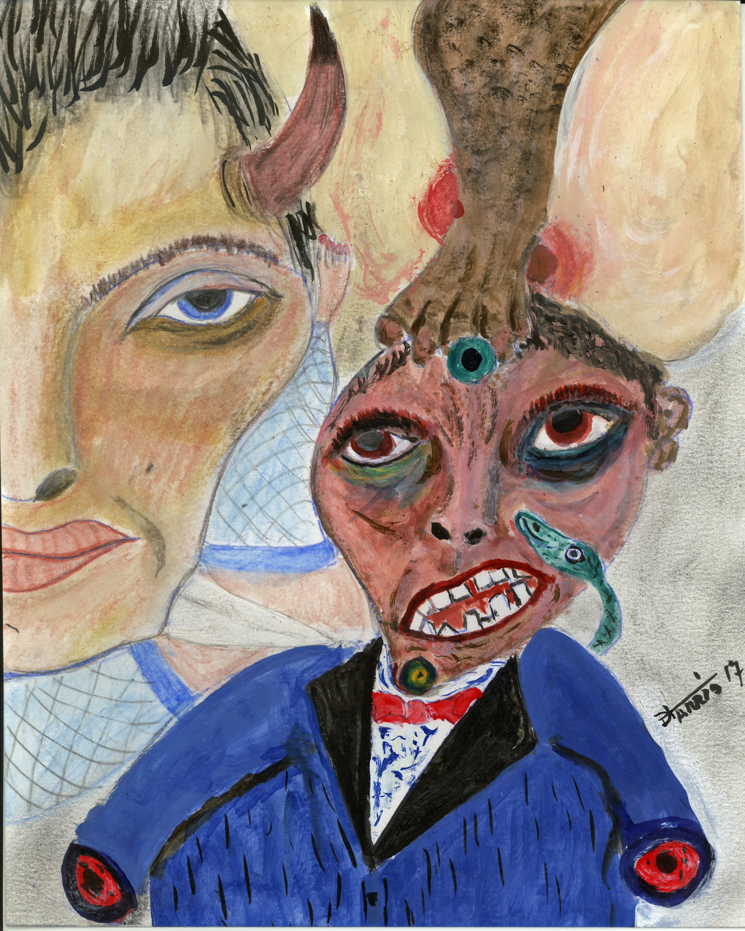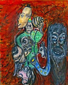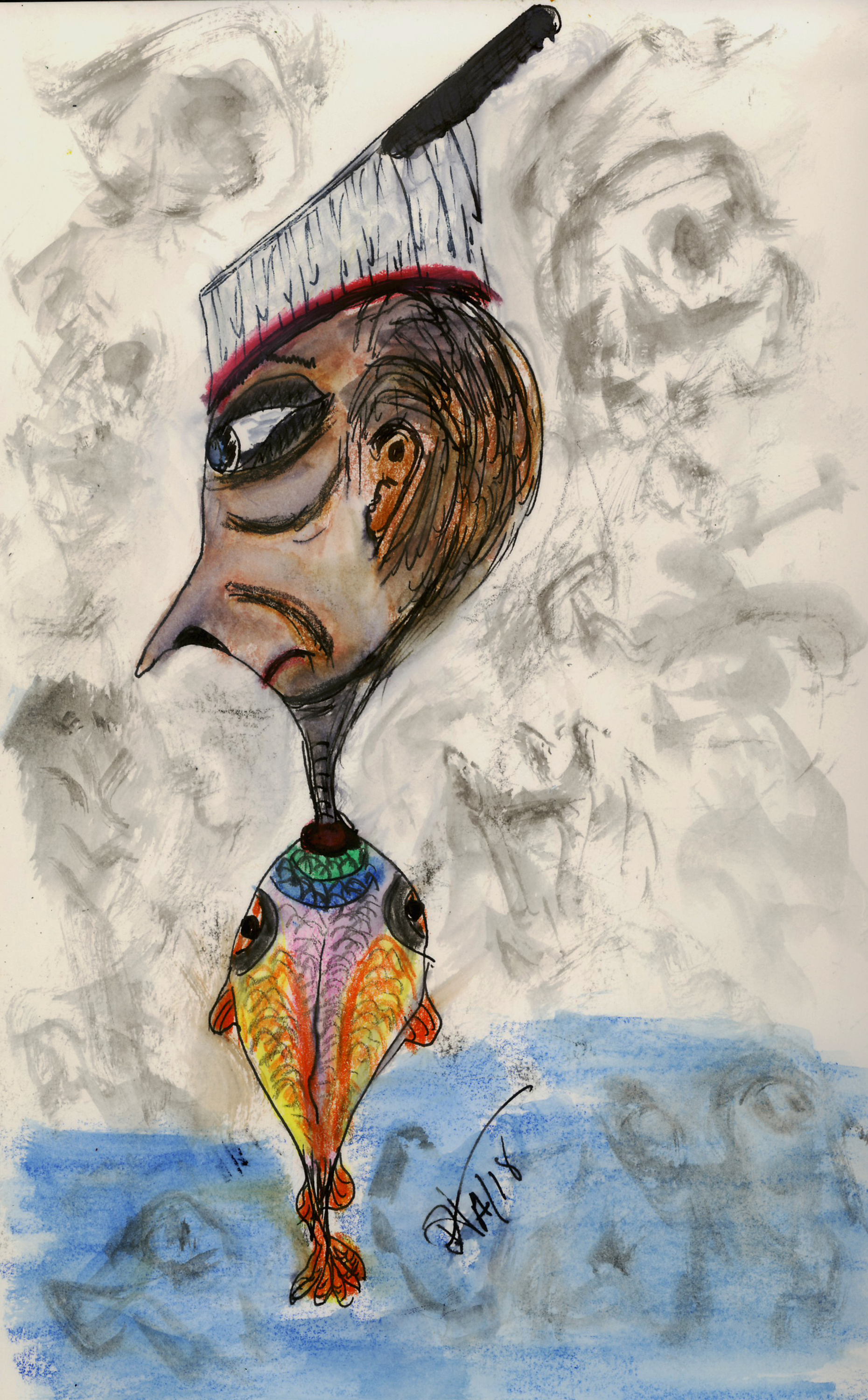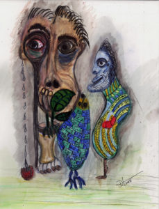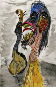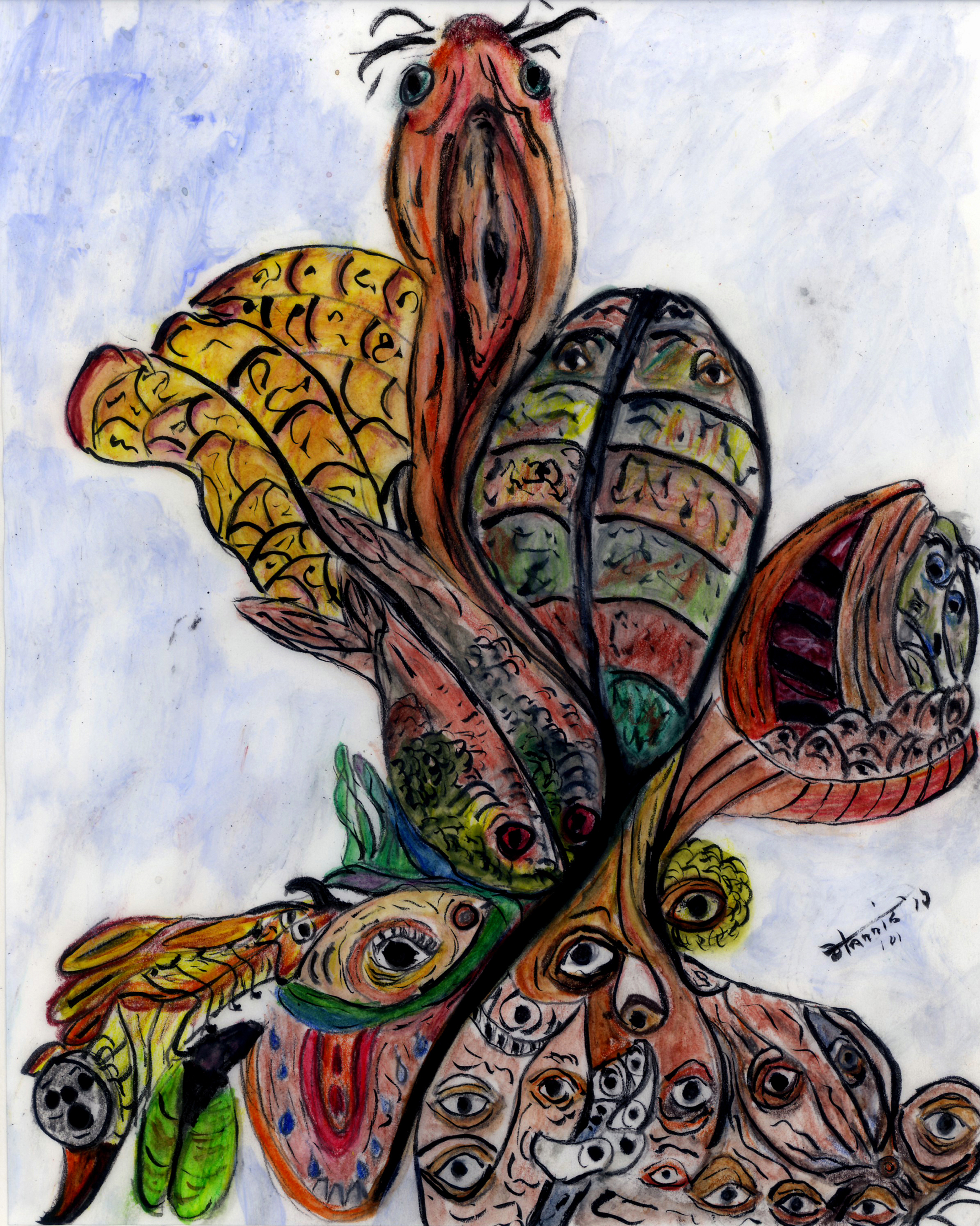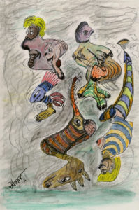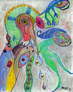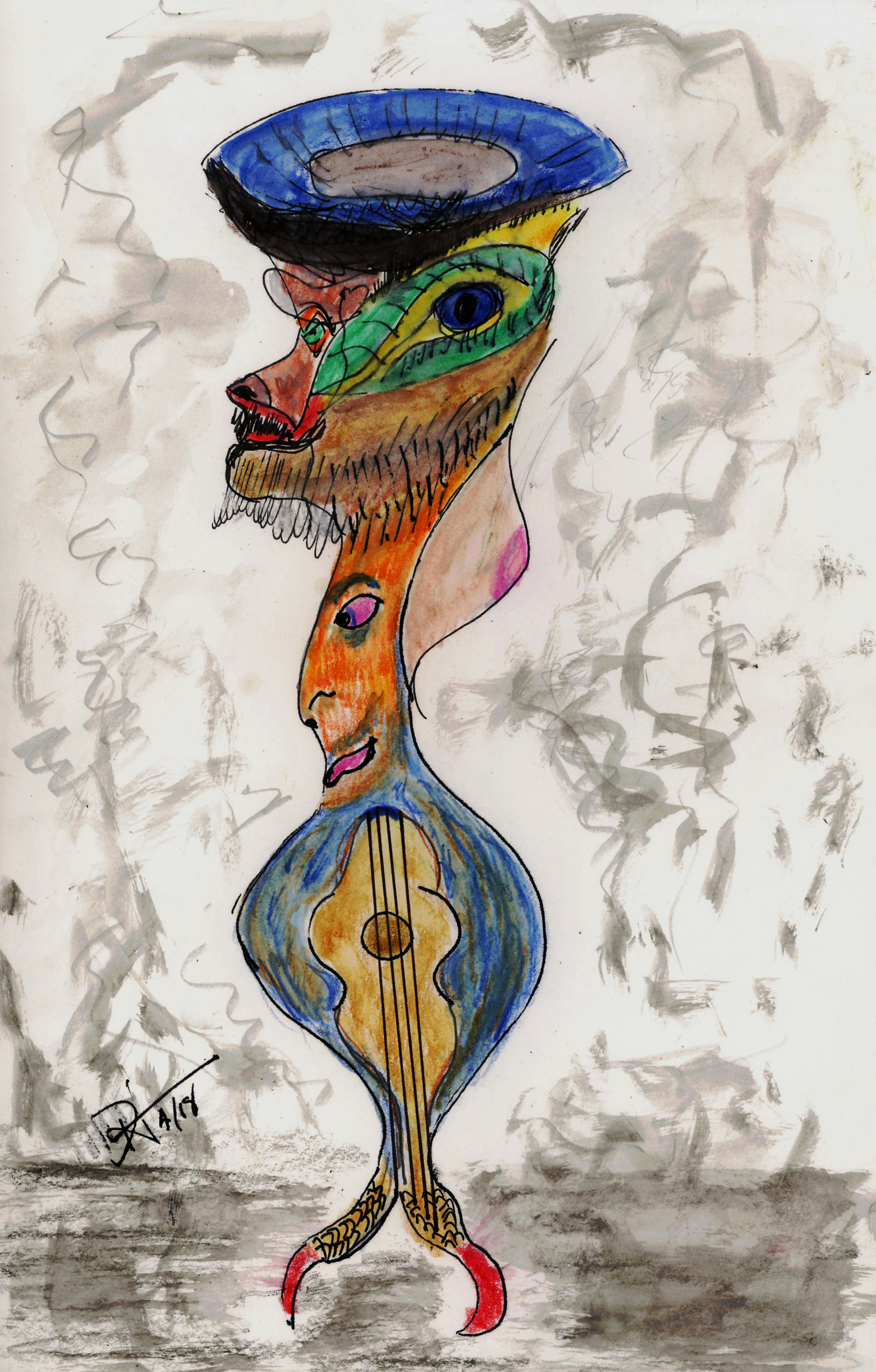 The Night Book is a folio of mixed-media paintings: pencil, ink, watercolor, Aquarelle pencil & acrylic. The paintings began as pencil, later ink, drawings made in my bedside Moleskine and Stillman & Birn sketchbooks while in that zone between wakefulness and sleep, A world devoid of reason but rich in images: half-formed, unrelated, surreal, erotic, even terrifying. A critic likened my phantasmagoric paintings to graphic poetry. Inspiration for the Night Book project came from Goya’s Los Caprichos (1799), and from François Desprez’s (1655) and Gustave Doré’s (1854) illustrations for Rabelais’s Pantagruel (1655), in my novel, The Nude Pianist (Fictionaut,­­­ 2016), a few of these paintings appear as the work of Francesco Martinelli.